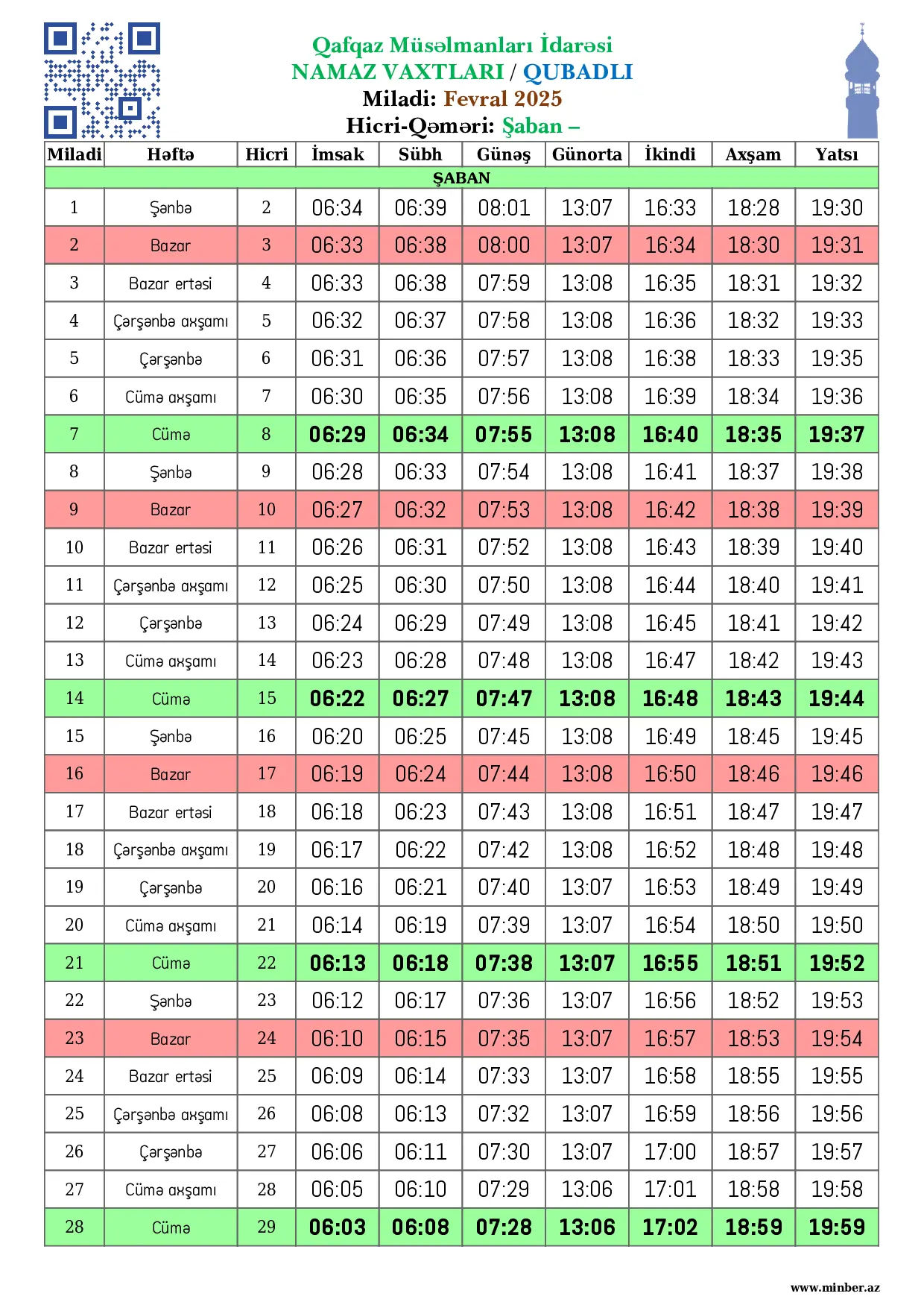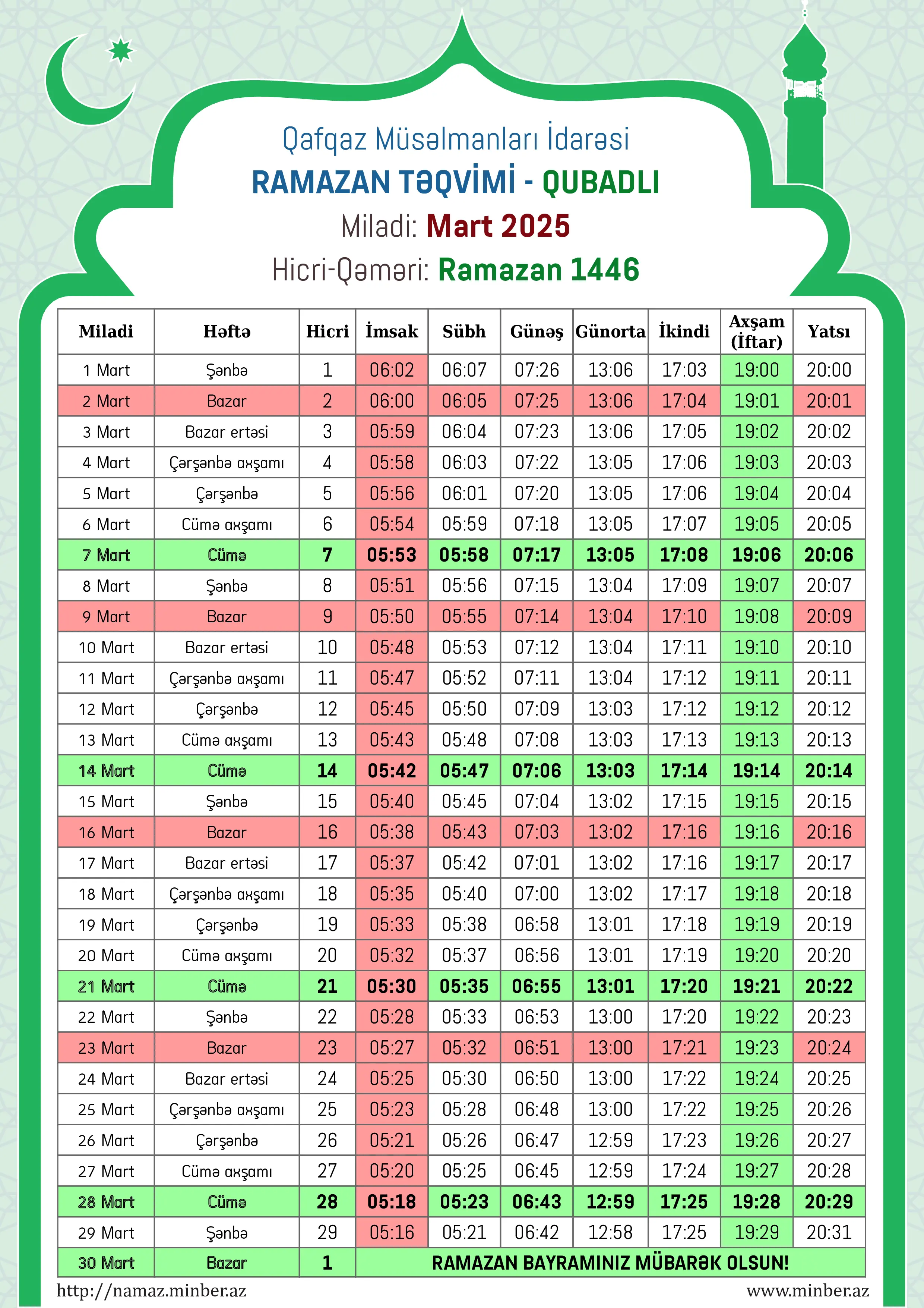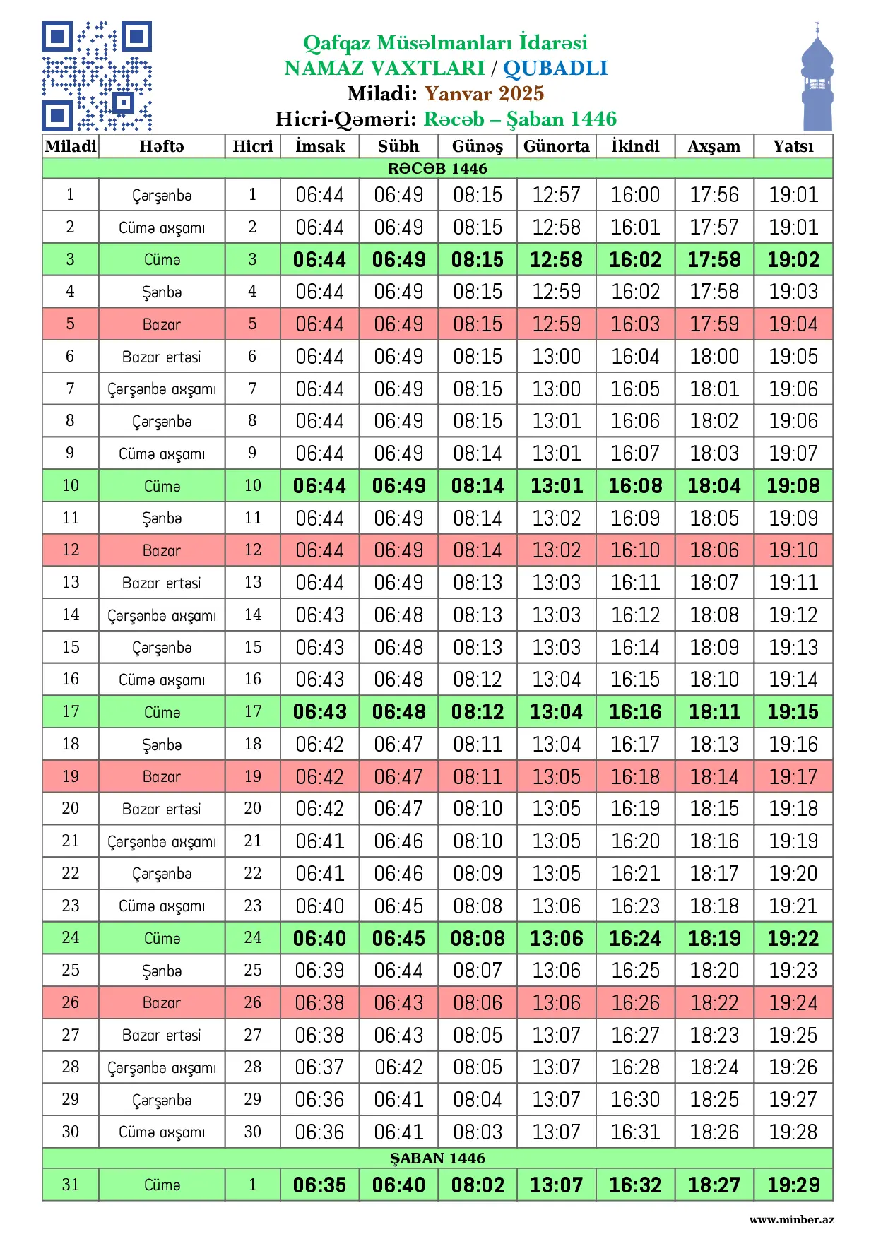 | 30 Dekabr 2025 | Çərşənbə axşamı | 10 Rəcəb 1447 | 06:43 | 06:48 | 08:14 | 12:56 | 15:58 | 17:54 | 18:59 |