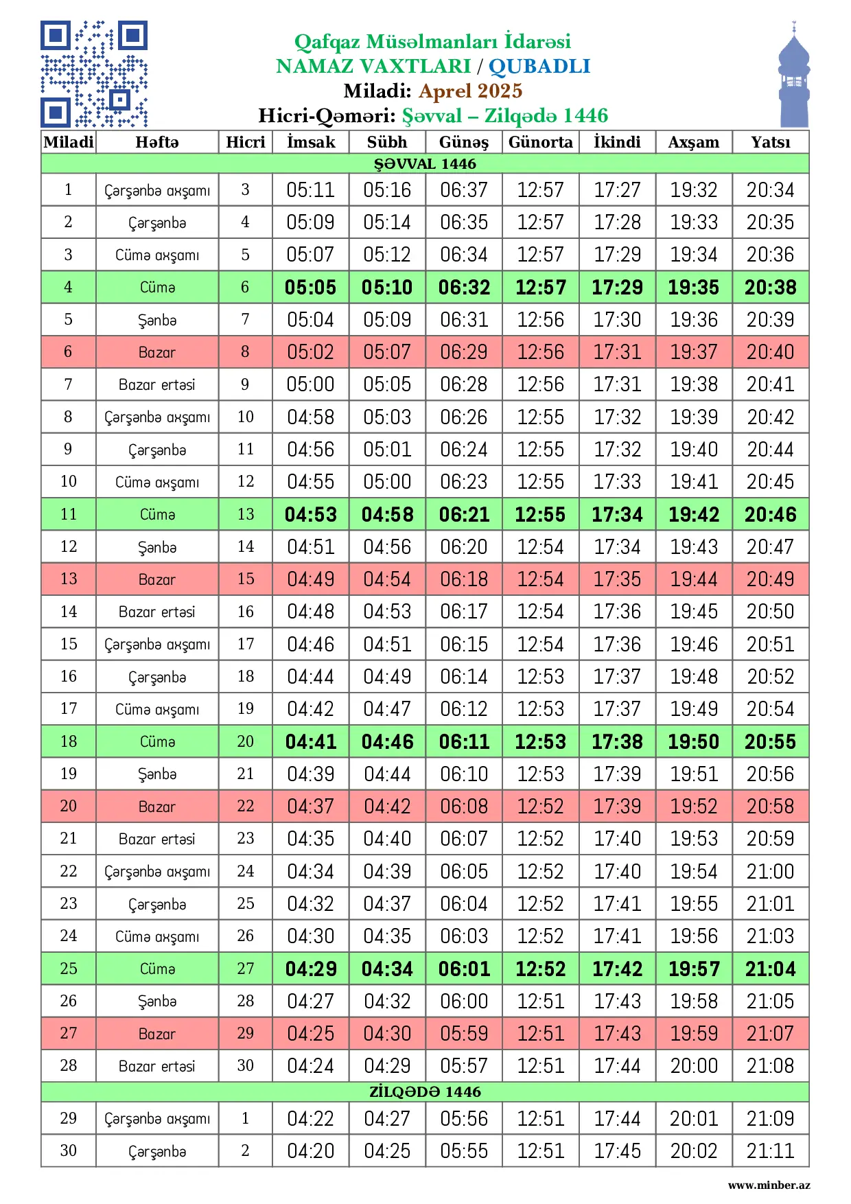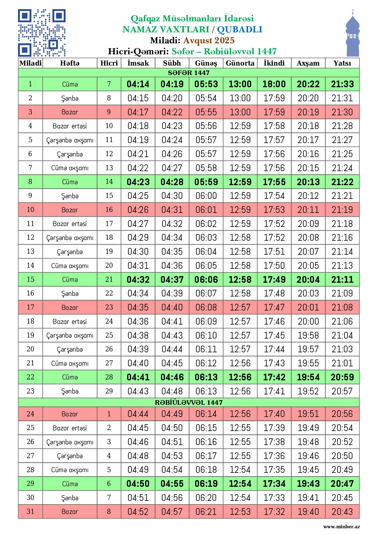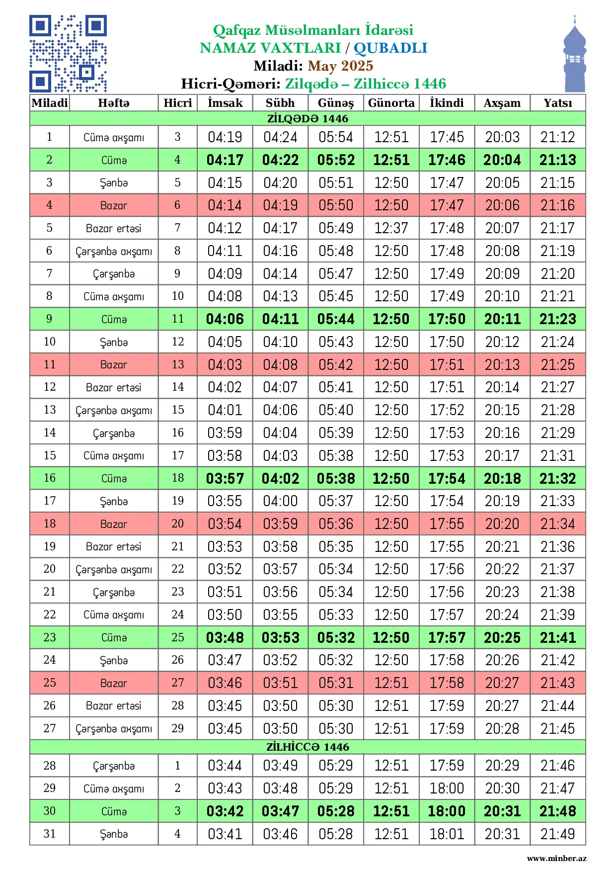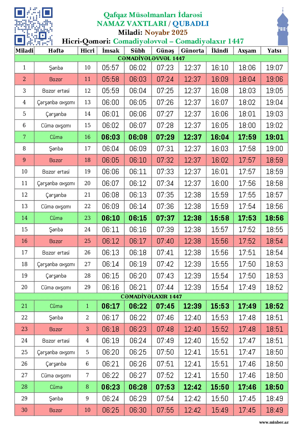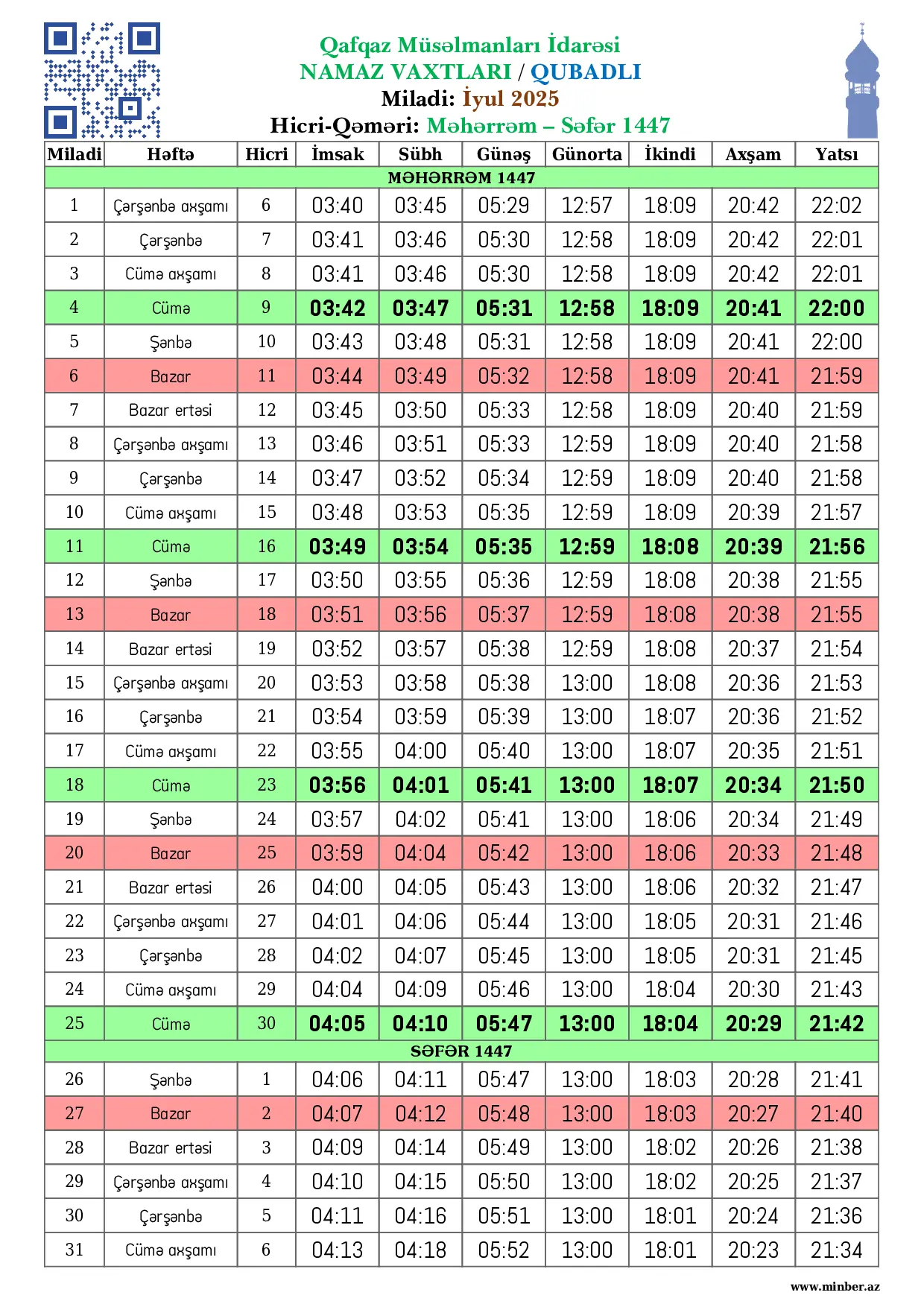 | Miladi | Həftə | Hicri | İmsak | Sübh namazı | Günəş | Günorta namazı | İkindi namazı | Axşam namazı | Yatsı namazı |
