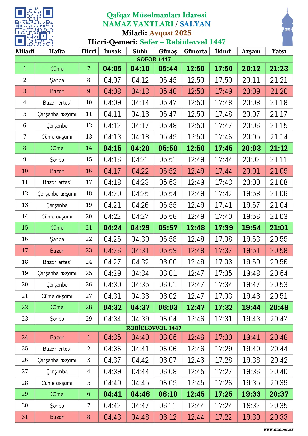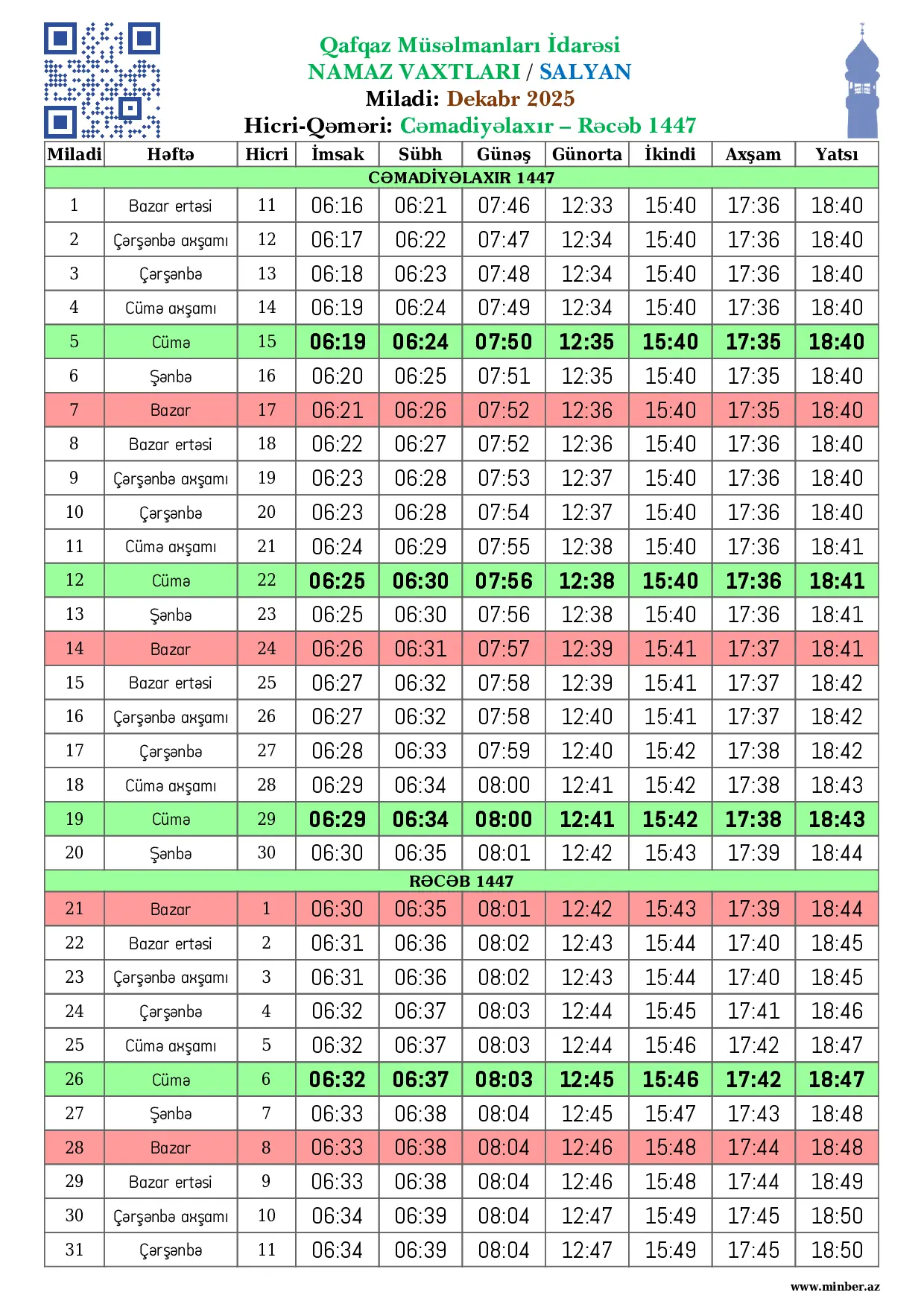 | 17 Noyabr 2025 | Bazar ertəsi | 26 Cəmadiyələvvəl 1447 | 06:03 | 06:08 | 07:31 | 12:29 | 15:47 | 17:42 | 18:45 |