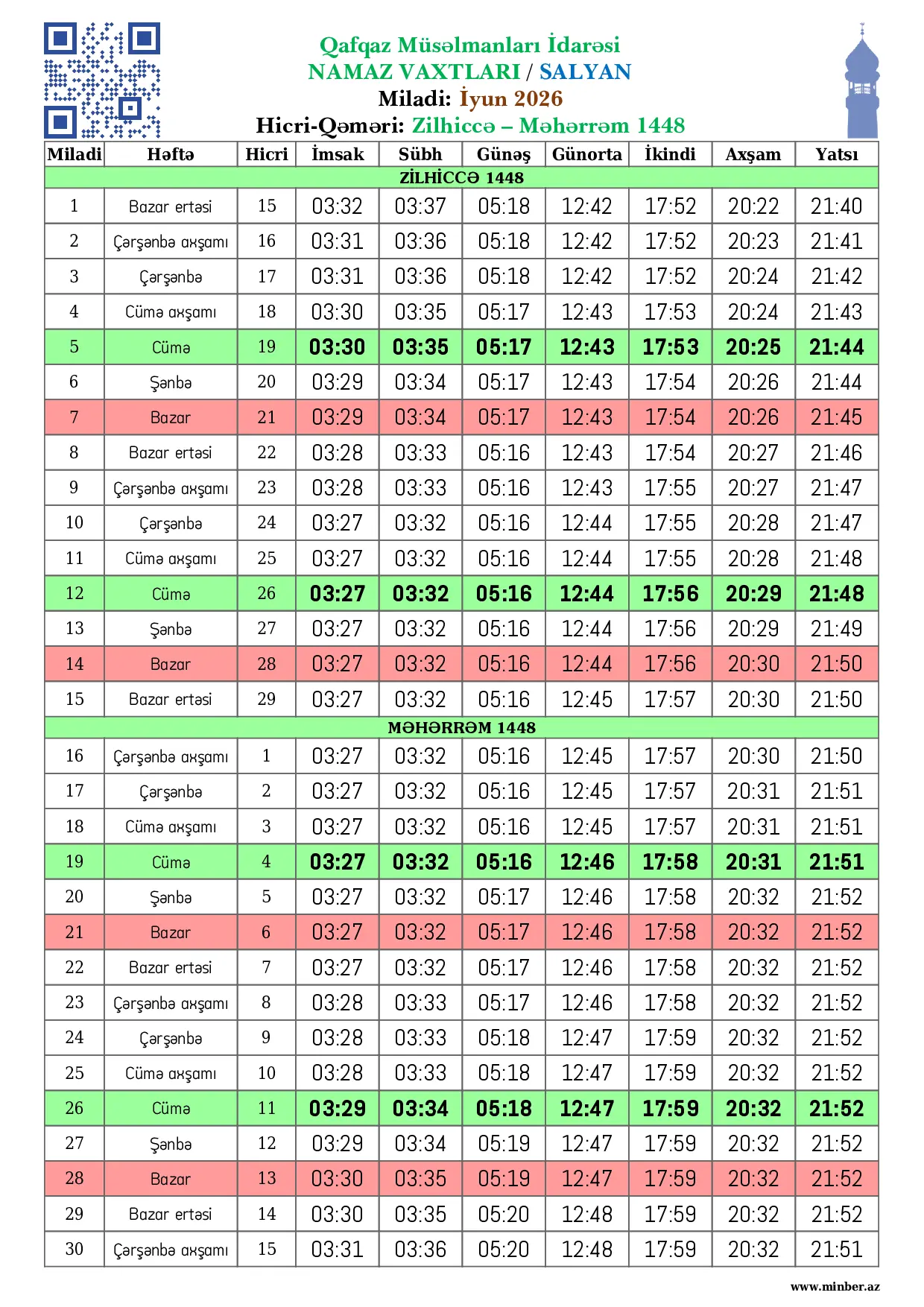 | Miladi | Həftə | Hicri | İmsak | Sübh namazı | Günəş | Günorta namazı | İkindi namazı | Axşam namazı | Yatsı namazı |
