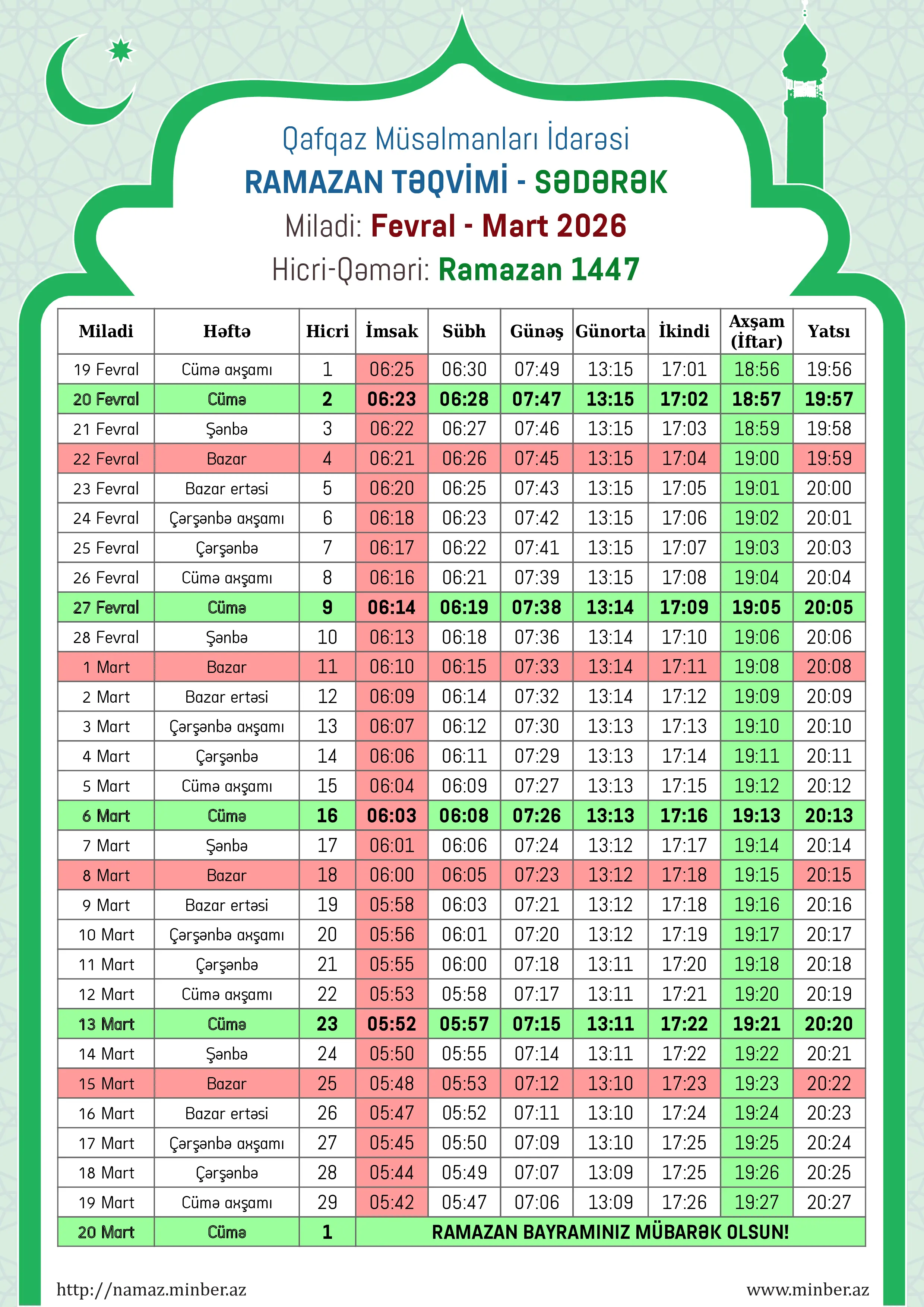 | 25 Fevral 2026 | Çərşənbə | 7 Ramazan 1447 | 06:17 | 06:22 | 07:41 | 13:15 | 17:07 | 19:03 | 20:03 |