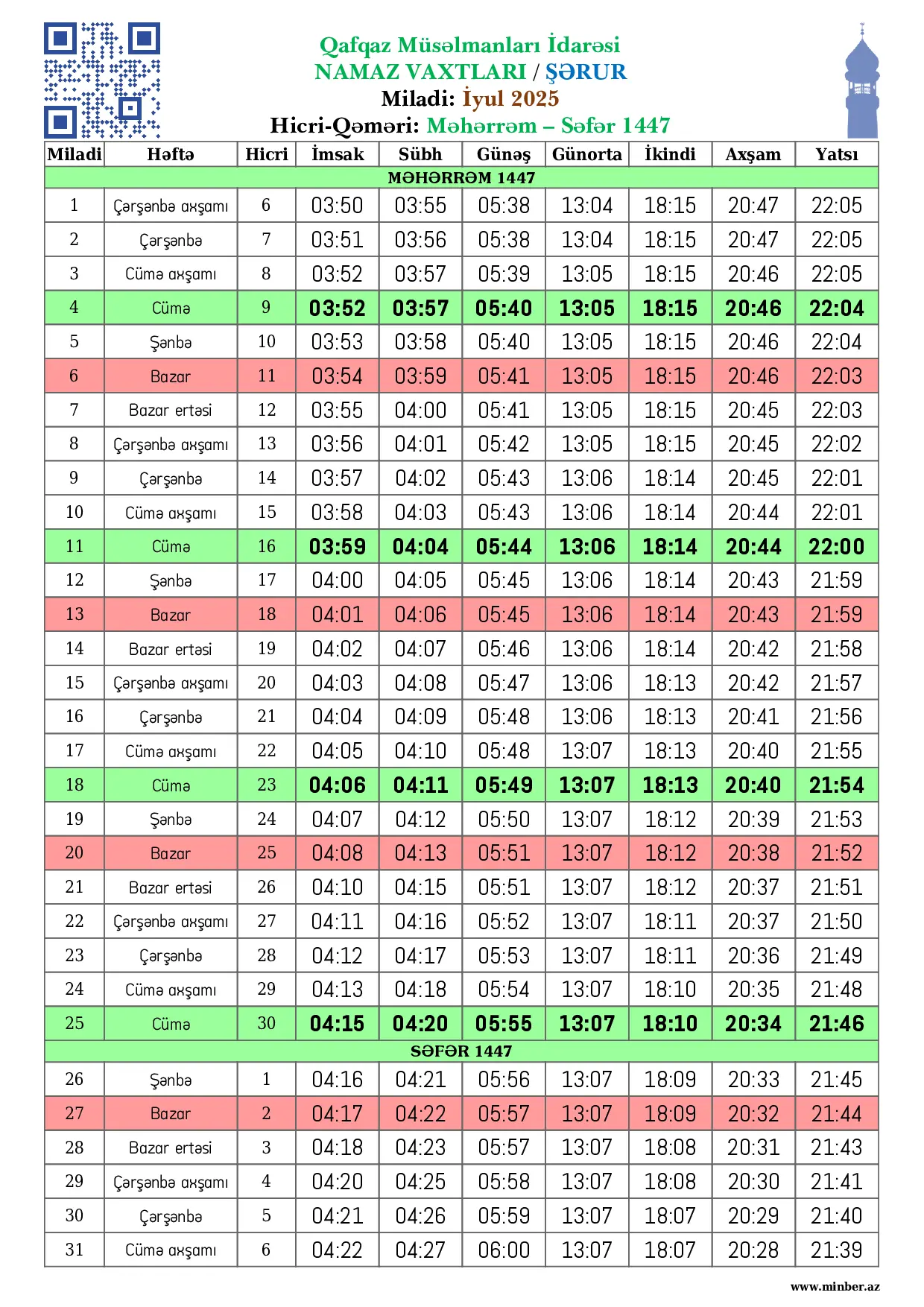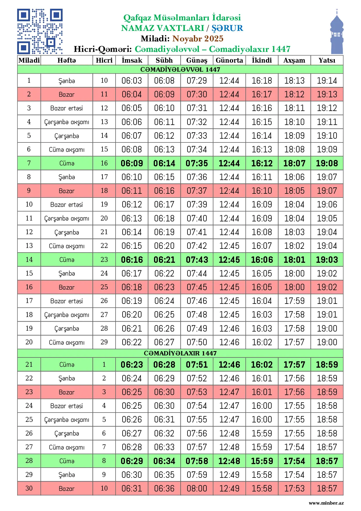 | 23 Noyabr 2025 | Bazar | 3 Cəmadiyəlaxır 1447 | 06:25 | 06:30 | 07:53 | 12:47 | 16:01 | 17:56 | 18:59 |