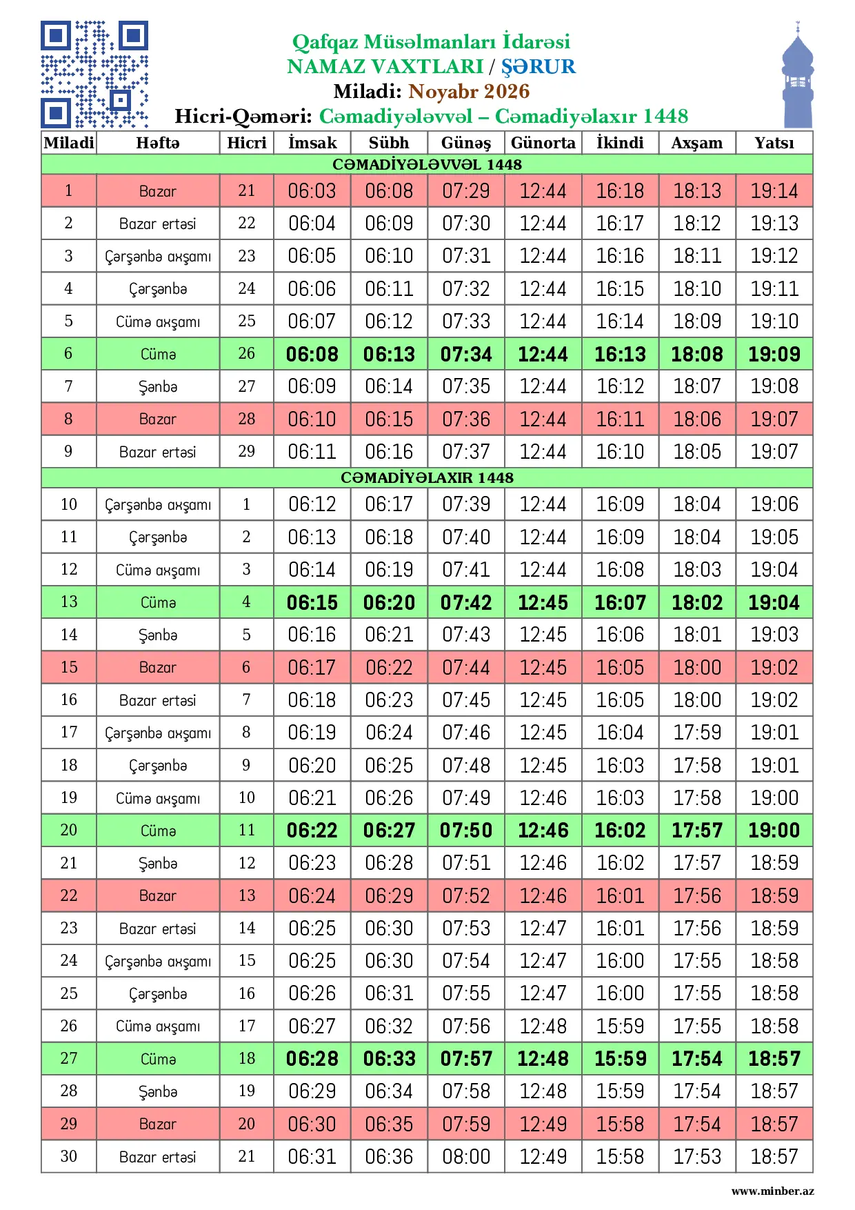 | 9 Yanvar 2026 | Cümə | 20 Rəcəb 1447 | 06:50 | 06:55 | 08:20 | 13:07 | 16:15 | 18:10 | 19:14 |