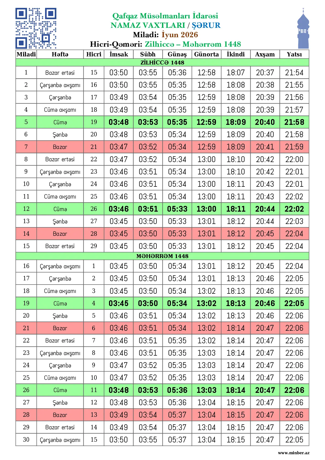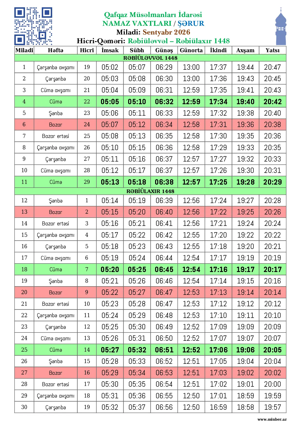 | 11 Yanvar 2026 | Bazar | 22 Rəcəb 1447 | 06:50 | 06:55 | 08:20 | 13:08 | 16:17 | 18:12 | 19:16 |