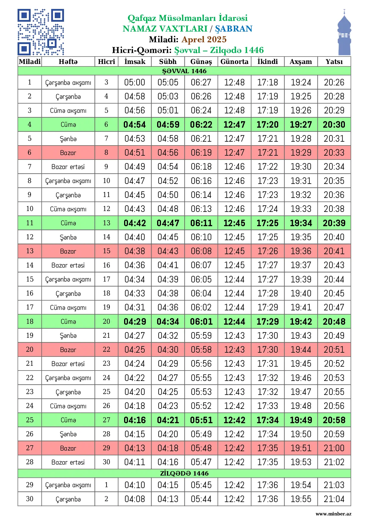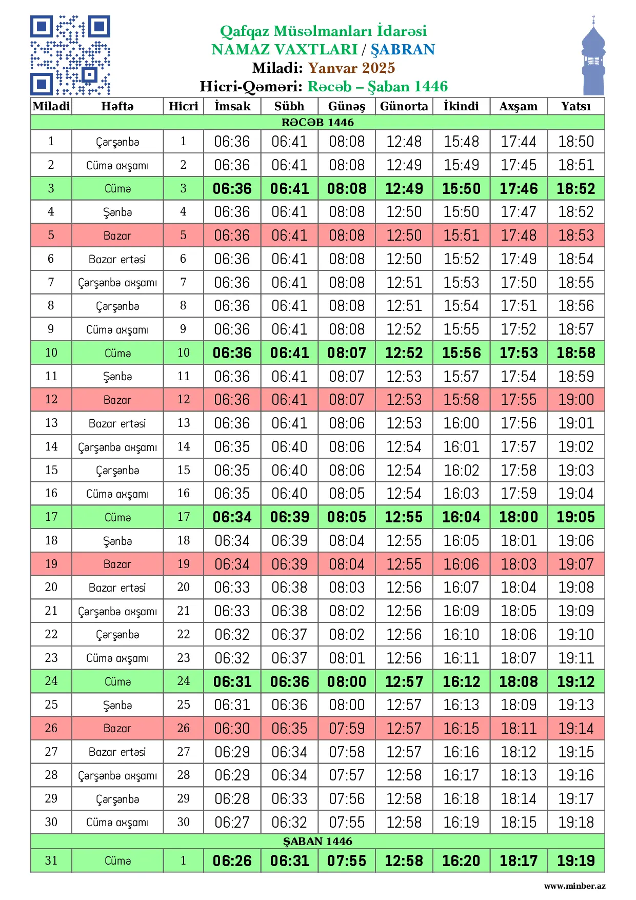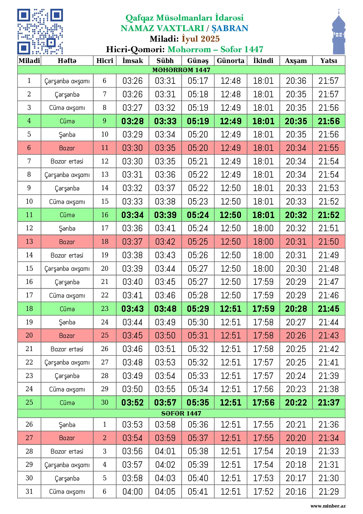 | 23 Noyabr 2025 | Bazar | 3 Cəmadiyəlaxır 1447 | 06:10 | 06:15 | 07:40 | 12:31 | 15:40 | 17:36 | 18:41 |