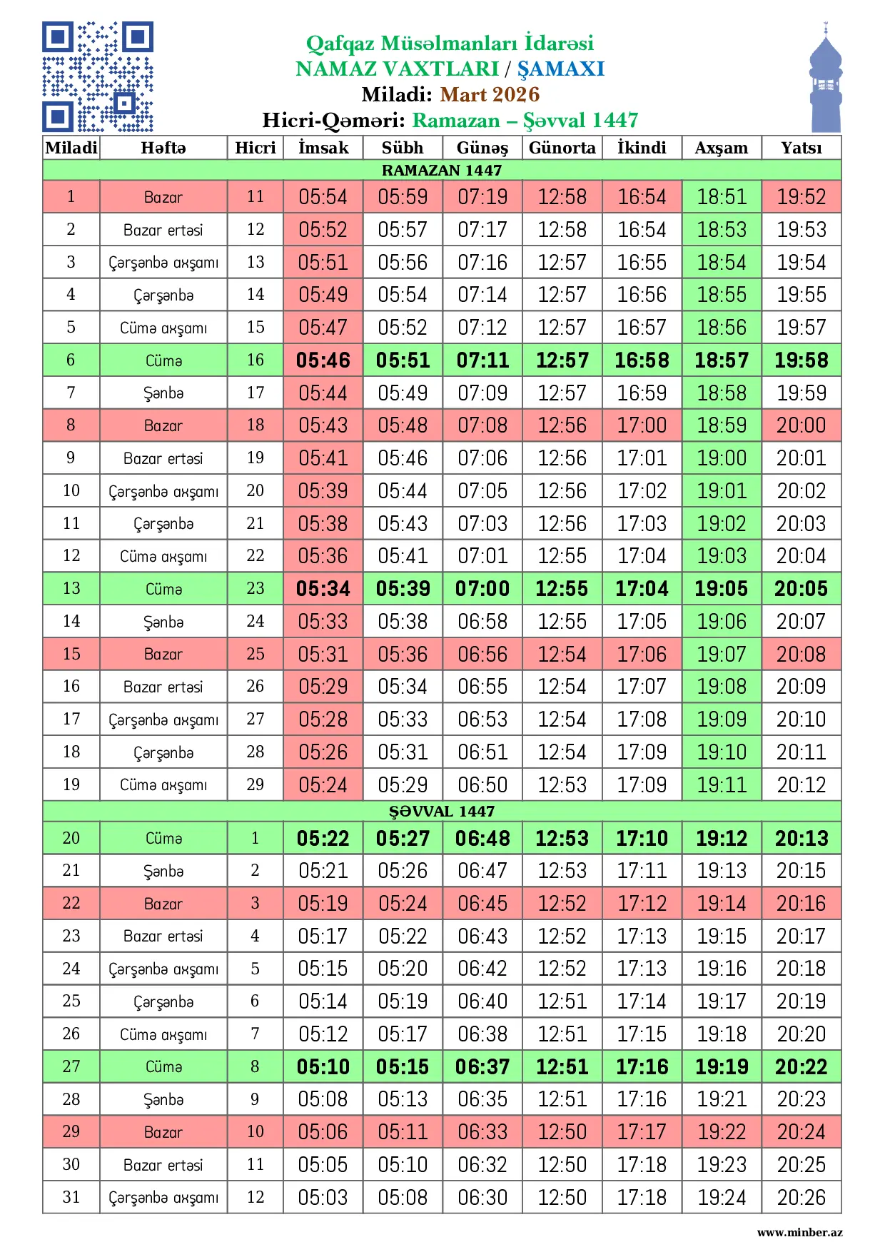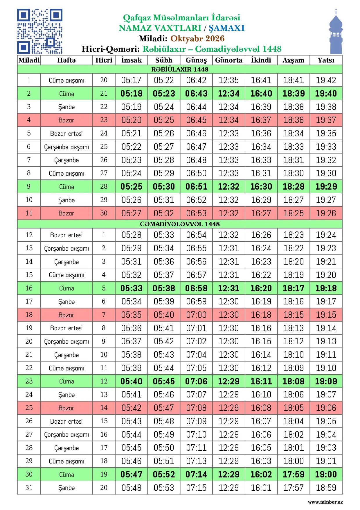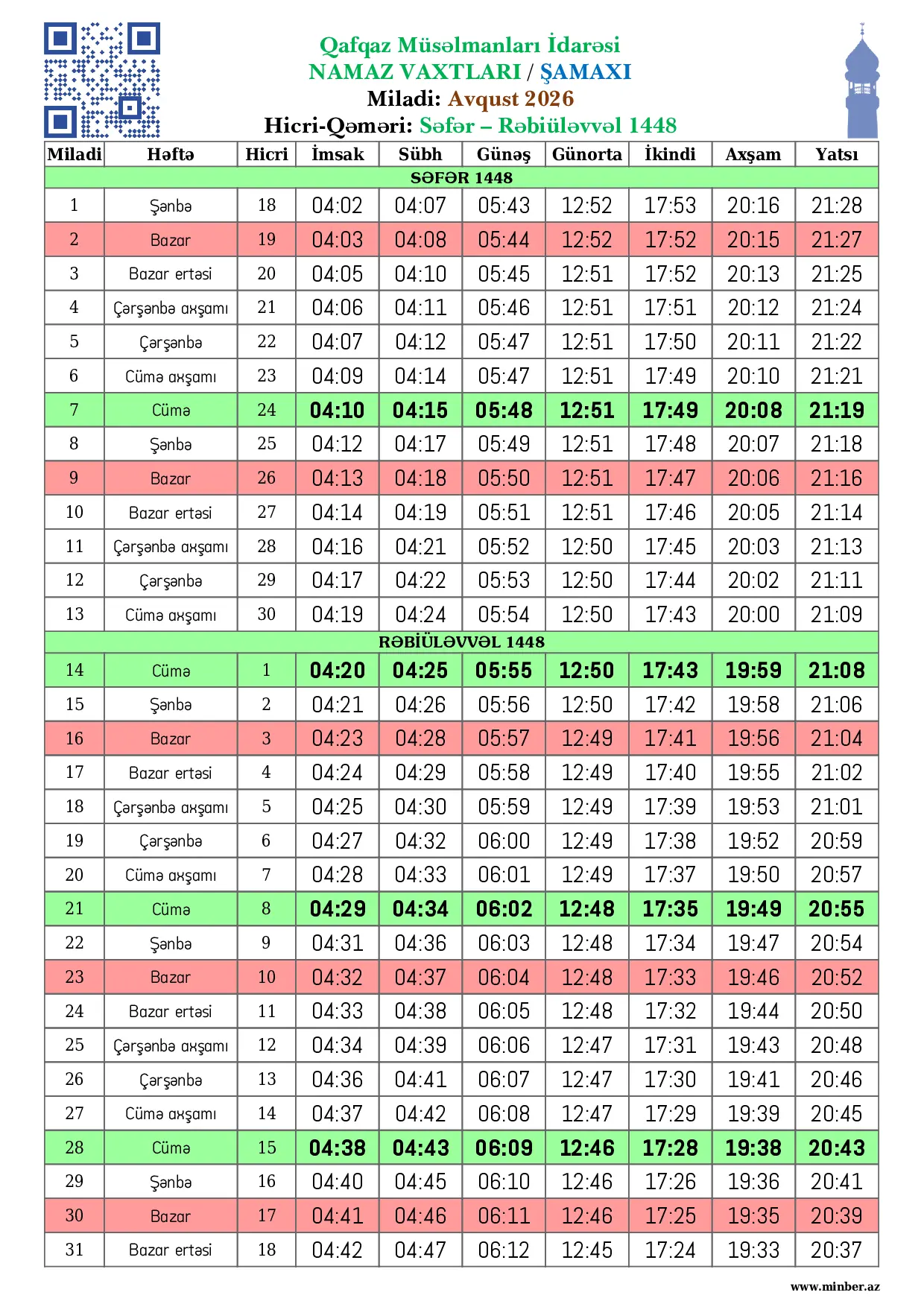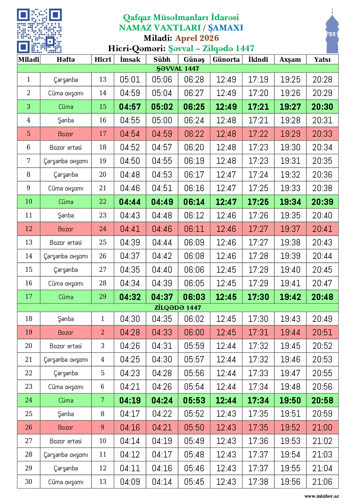 | 25 Aprel 2026 | Şənbə | 8 Zilqədə 1447 | 04:17 | 04:22 | 05:52 | 12:43 | 17:35 | 19:51 | 20:59 |