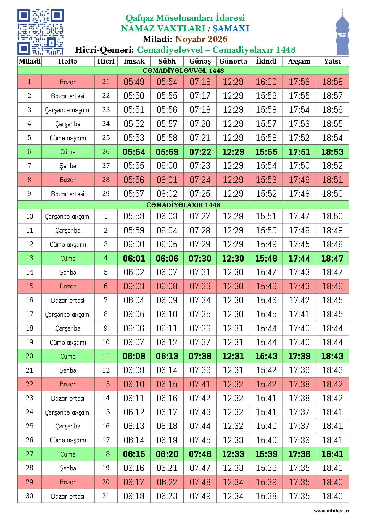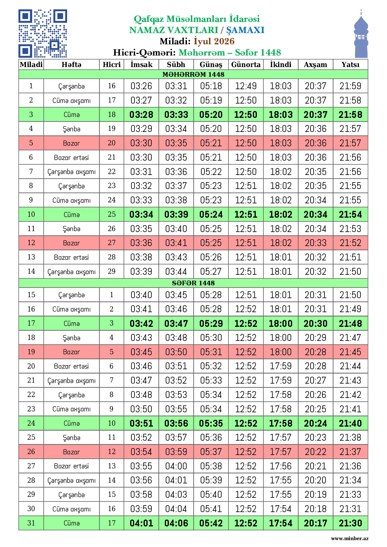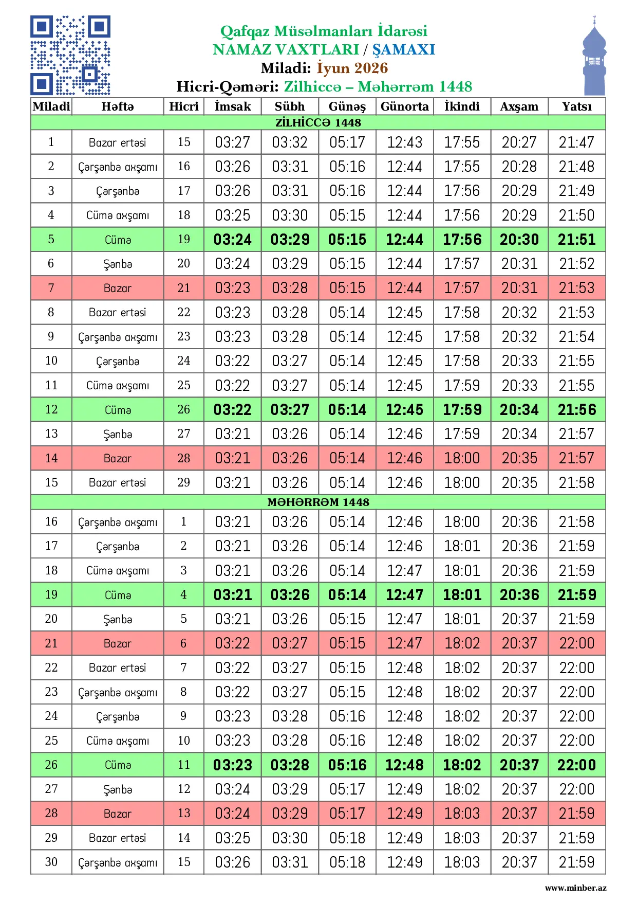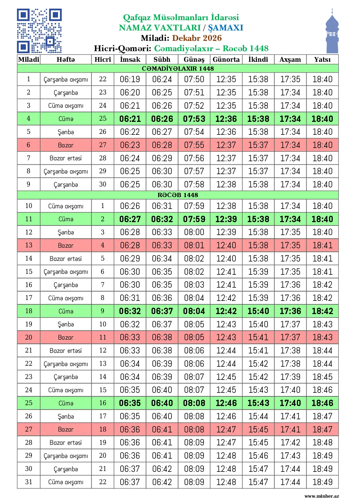 | Miladi | Həftə | Hicri | İmsak | Sübh namazı | Günəş | Günorta namazı | İkindi namazı | Axşam namazı | Yatsı namazı |