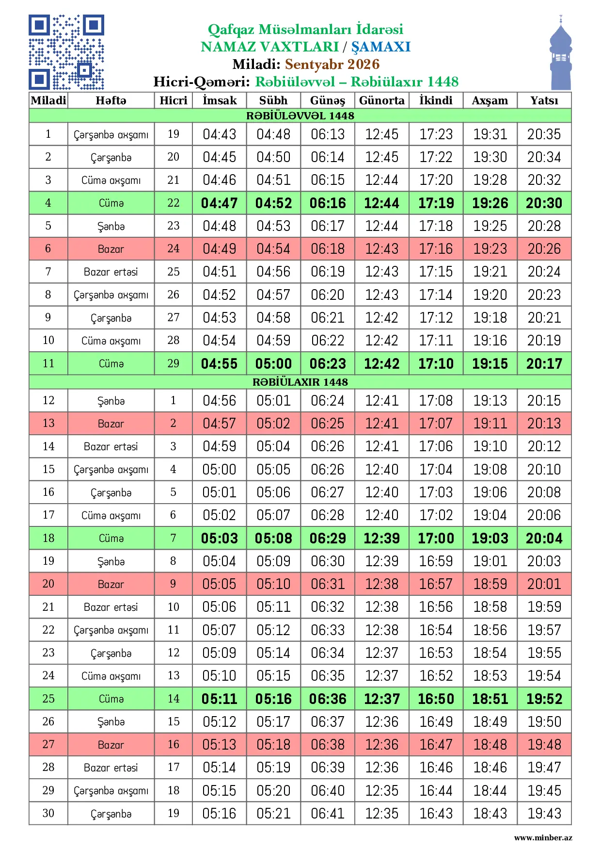 | 26 Aprel 2026 | Bazar | 9 Zilqədə 1447 | 04:16 | 04:21 | 05:50 | 12:43 | 17:35 | 19:52 | 21:00 |