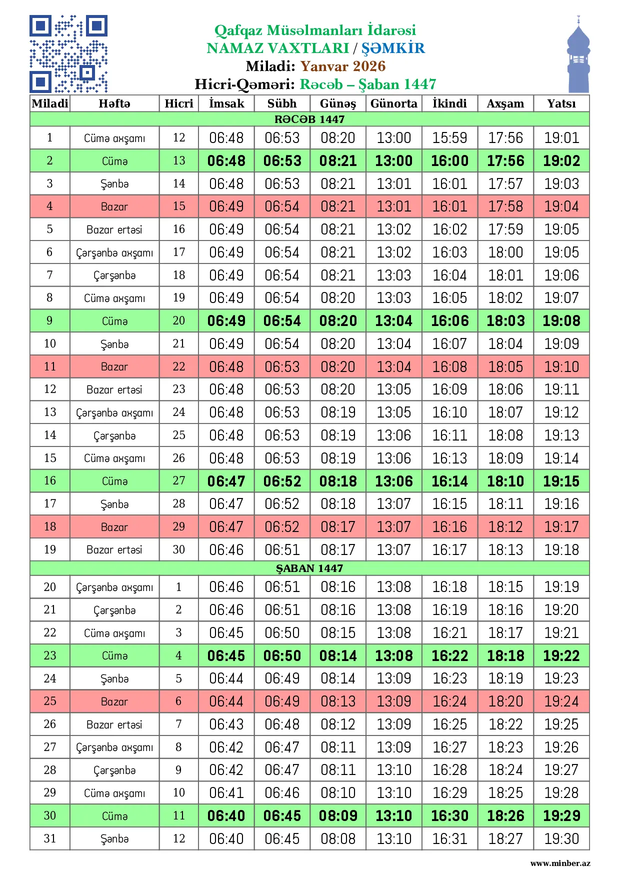 | Miladi | Həftə | Hicri | İmsak | Sübh namazı | Günəş | Günorta namazı | İkindi namazı | Axşam namazı | Yatsı namazı |