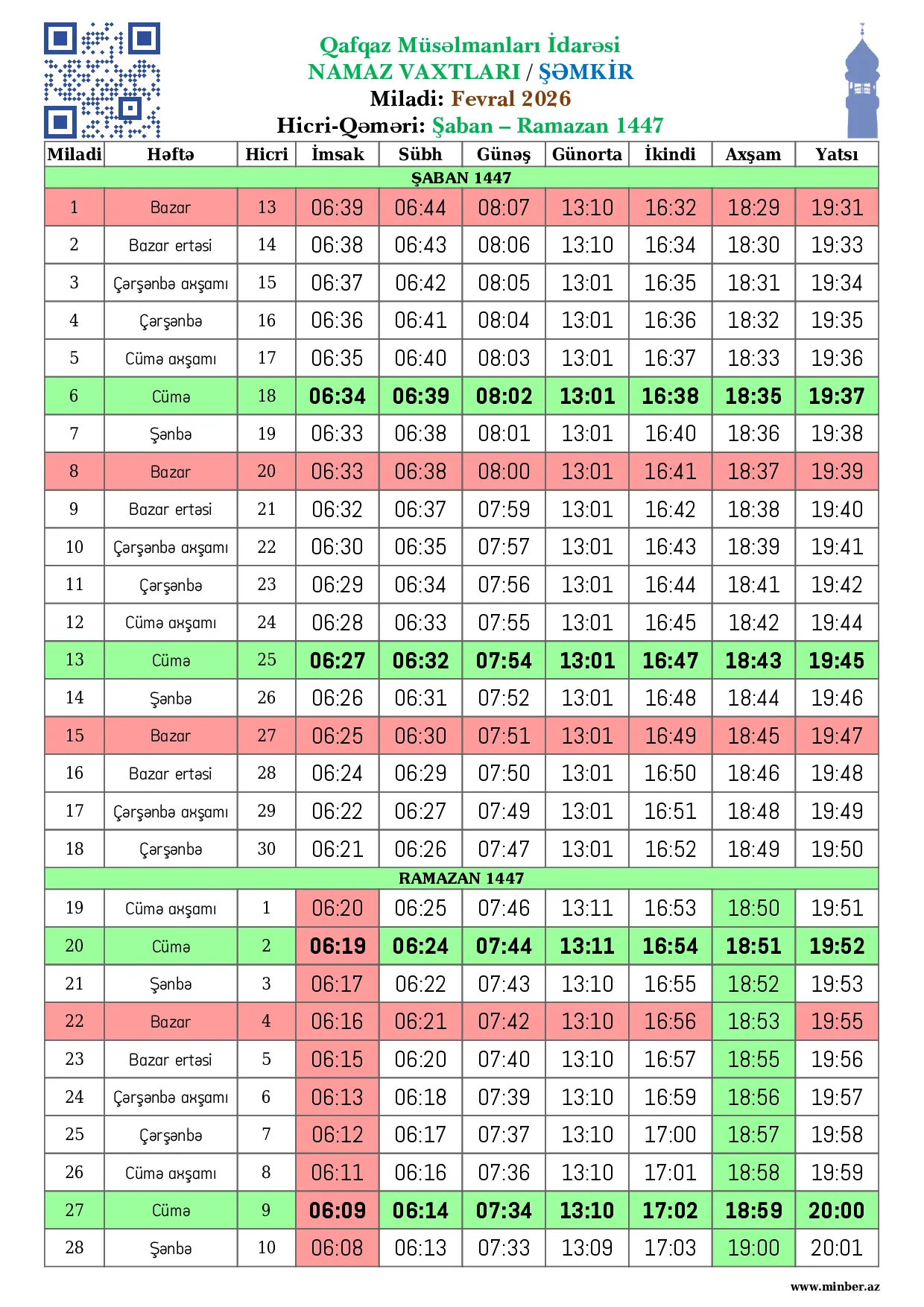 | 7 Fevral 2026 | Şənbə | 19 Şaban 1447 | 06:33 | 06:38 | 08:01 | 13:01 | 16:40 | 18:36 | 19:38 |