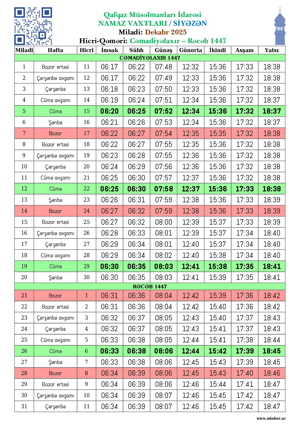 | 23 Noyabr 2025 | Bazar | 3 Cəmadiyəlaxır 1447 | 06:09 | 06:14 | 07:39 | 12:30 | 15:39 | 17:35 | 18:40 |
