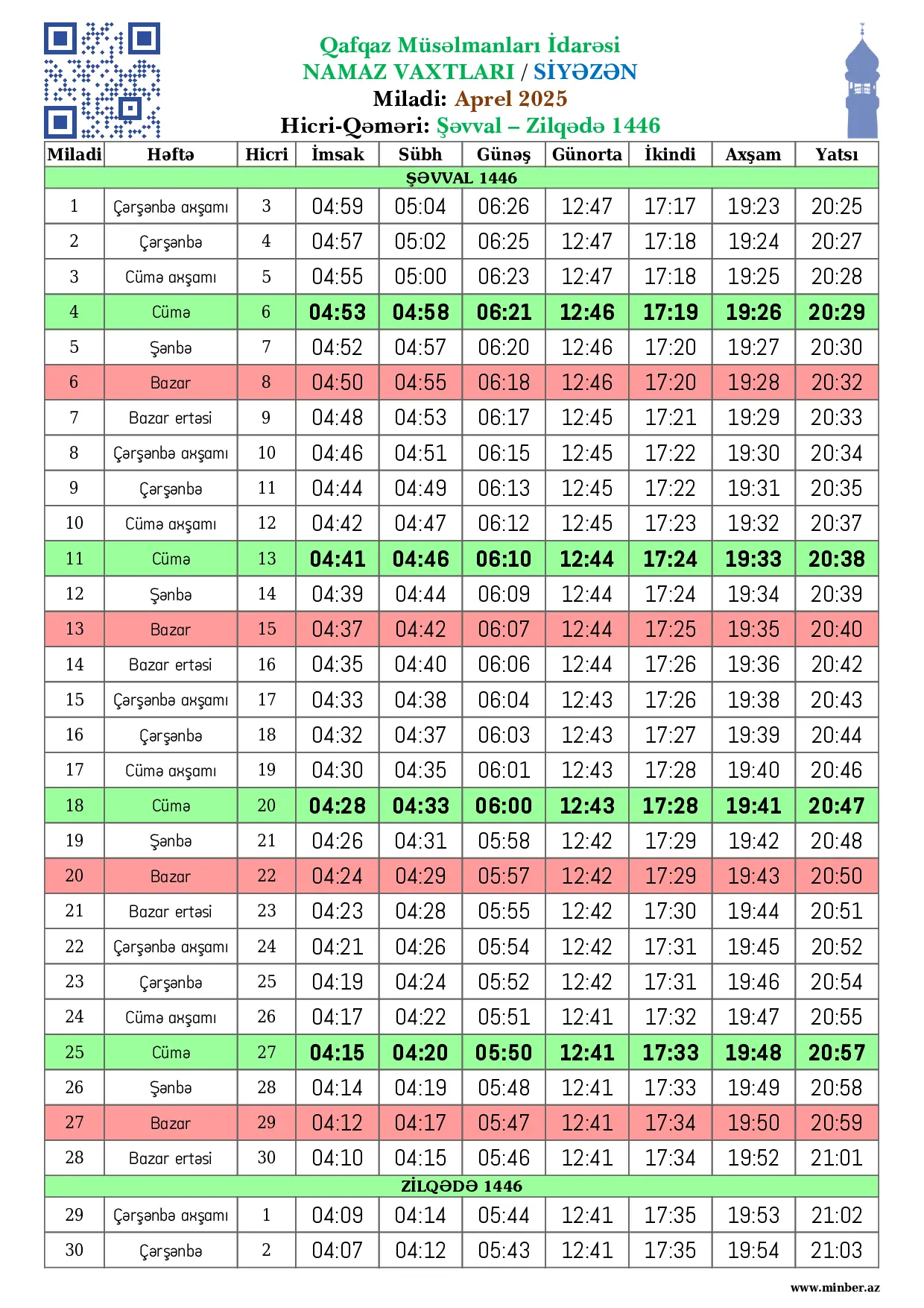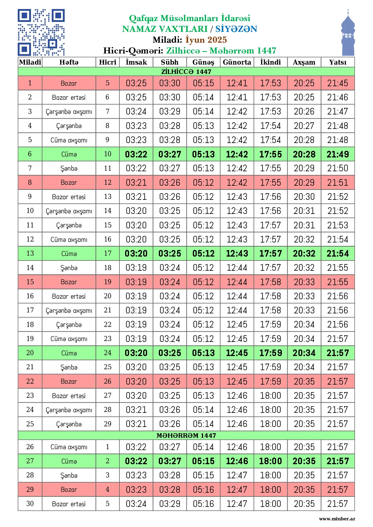 | Miladi | Həftə | Hicri | İmsak | Sübh namazı | Günəş | Günorta namazı | İkindi namazı | Axşam namazı | Yatsı namazı |