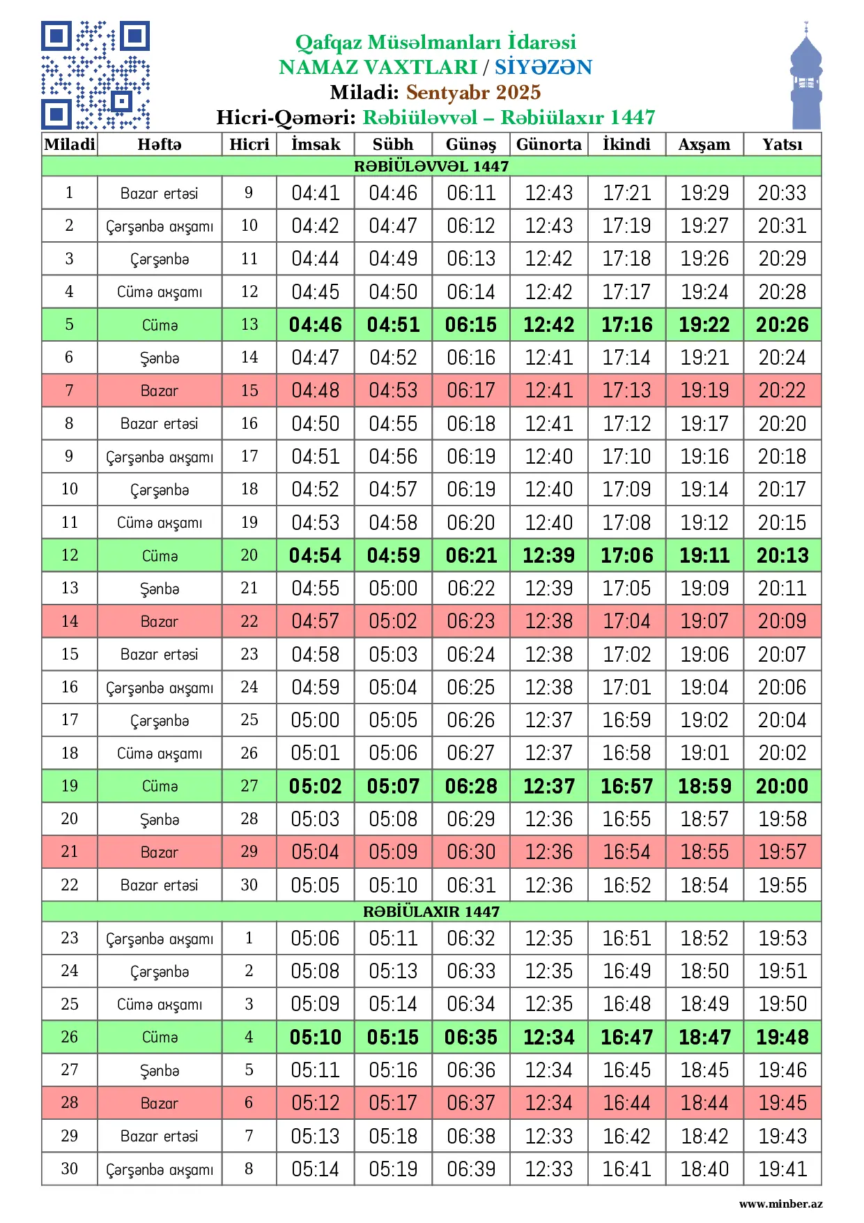 | 20 Noyabr 2025 | Cümə axşamı | 29 Cəmadiyələvvəl 1447 | 06:06 | 06:11 | 07:36 | 12:29 | 15:41 | 17:37 | 18:41 |