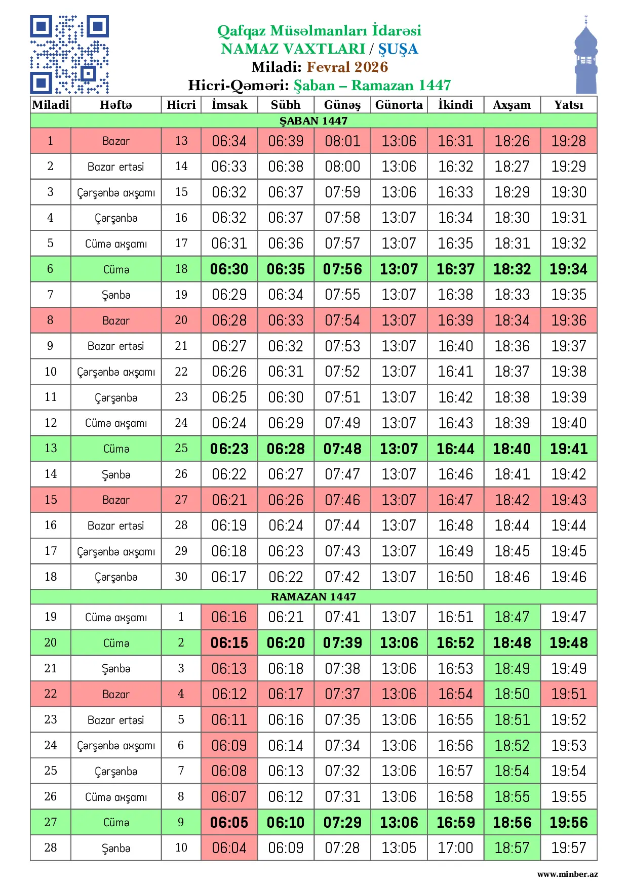 2 Fevral 2026 / Bazar ertəsi / 14 Şaban 1447