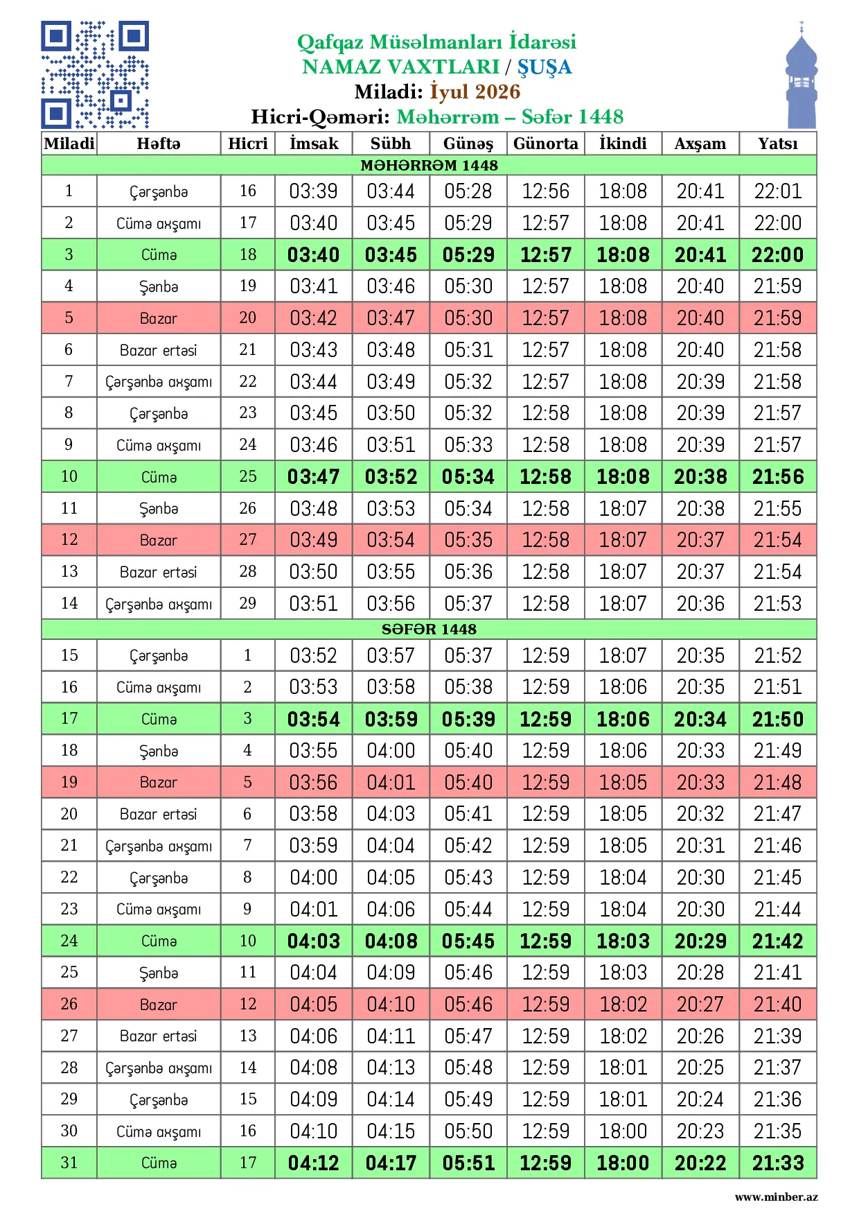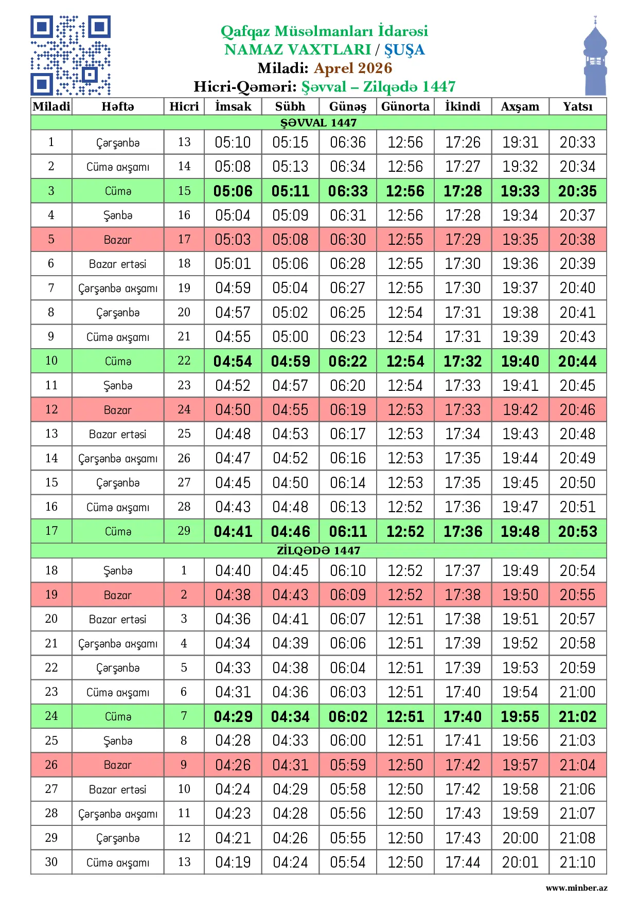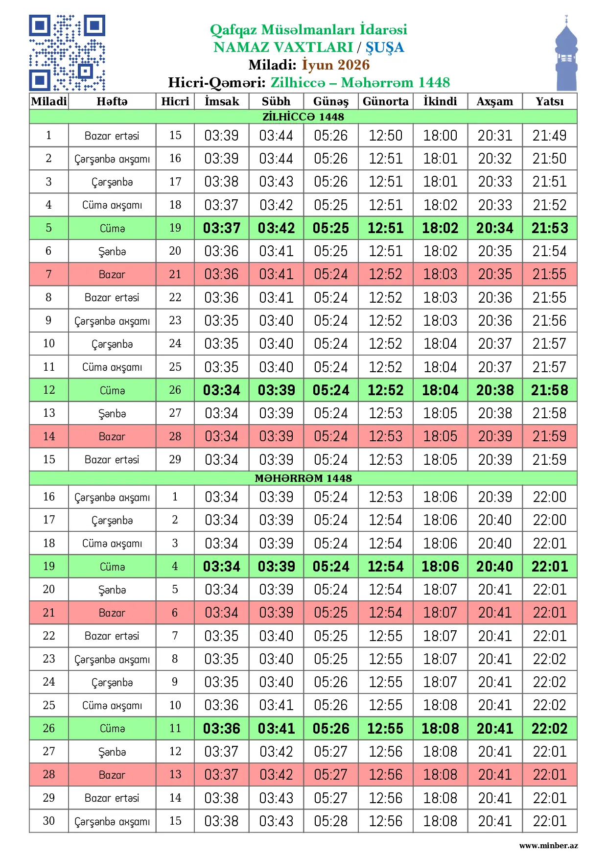 Miladi Həftə Hicri İmsak Sübh namazı Günəş Günorta namazı İkindi namazı Axşam namazı Yatsı namazı