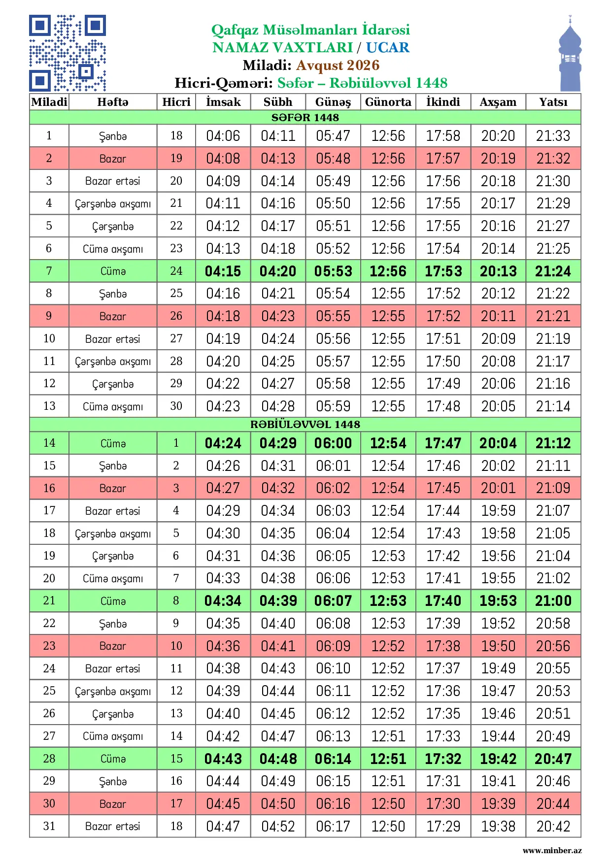 | 9 Yanvar 2026 | Cümə | 20 Rəcəb 1447 | 06:42 | 06:47 | 08:14 | 12:57 | 16:00 | 17:56 | 19:02 |