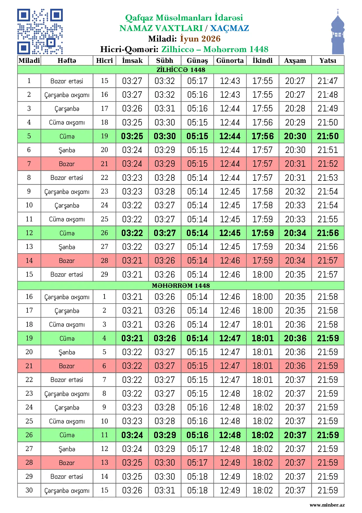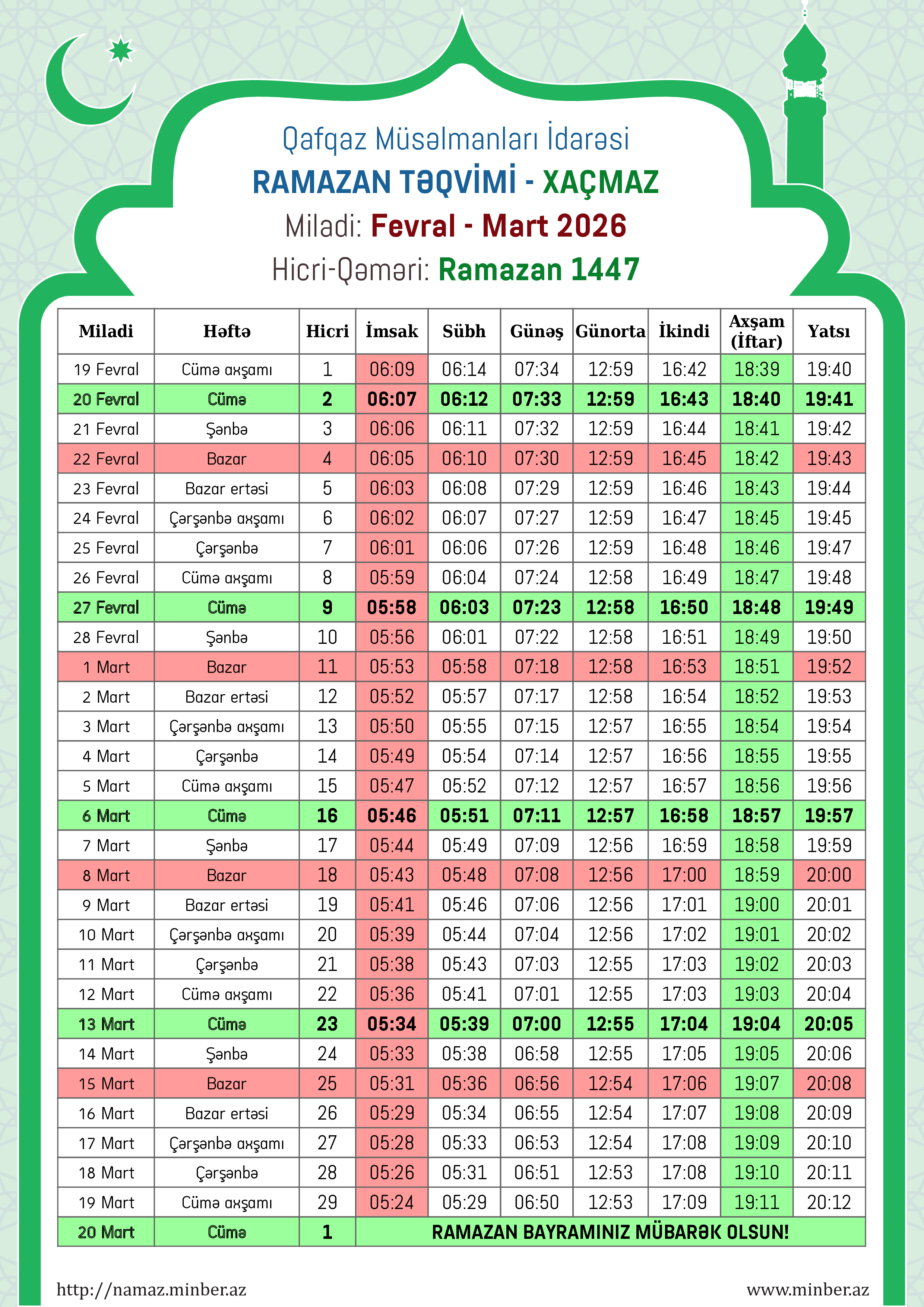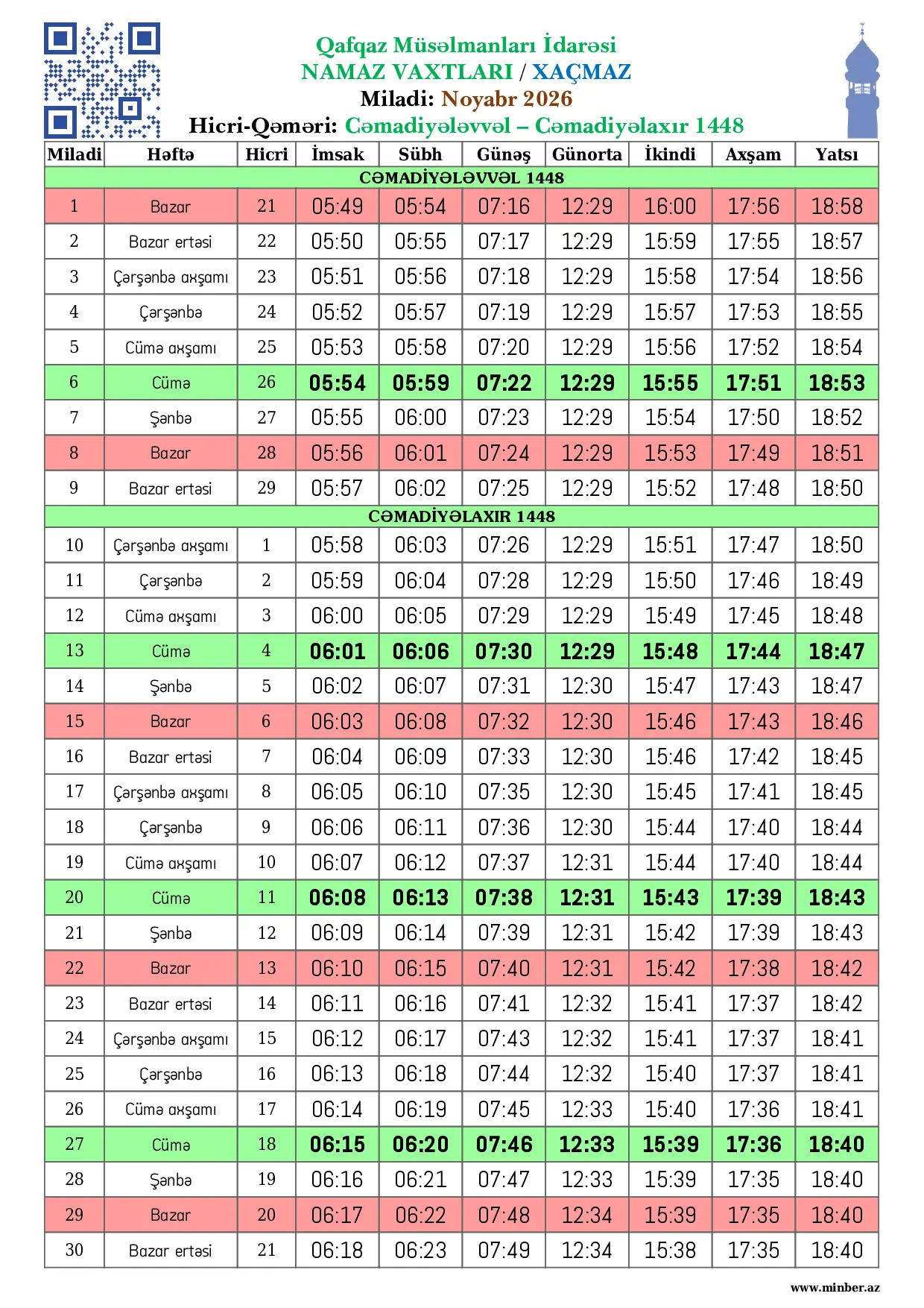 | 26 Fevral 2026 | Cümə axşamı | 8 Ramazan 1447 | 05:59 | 06:04 | 07:24 | 12:58 | 16:49 | 18:47 | 19:48 |