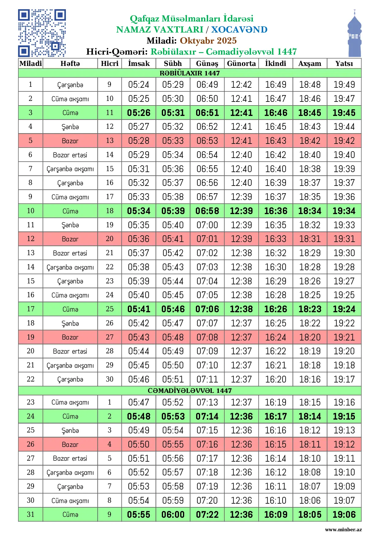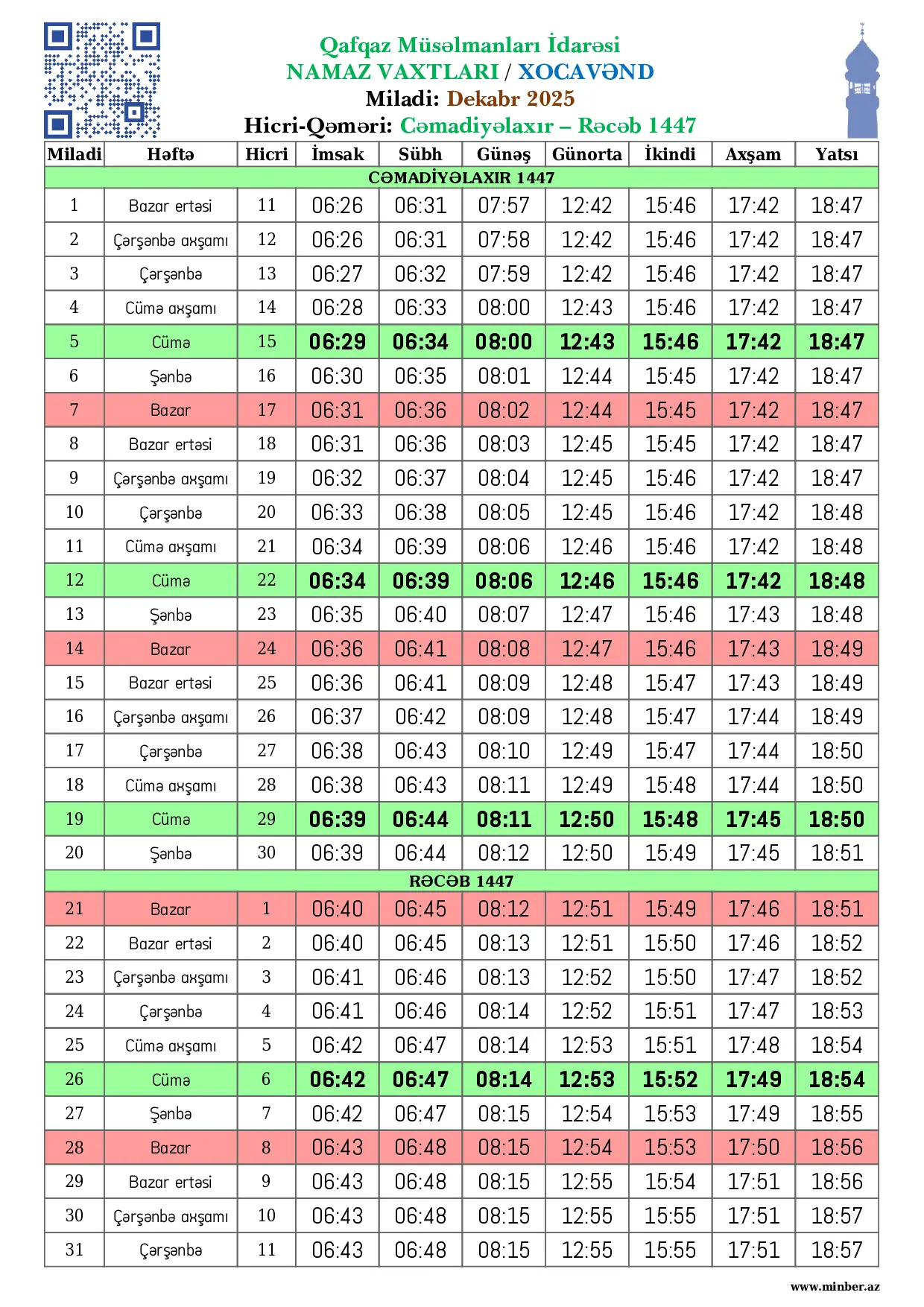 | 17 Noyabr 2025 | Bazar ertəsi | 26 Cəmadiyələvvəl 1447 | 06:12 | 06:17 | 07:41 | 12:37 | 15:53 | 17:49 | 18:52 |