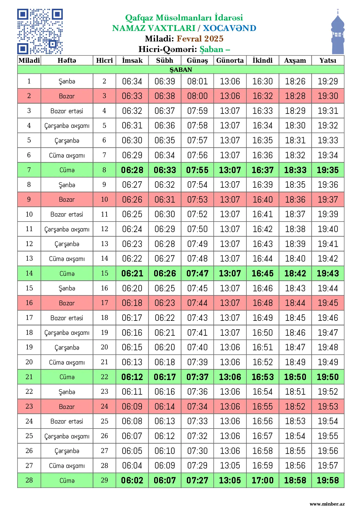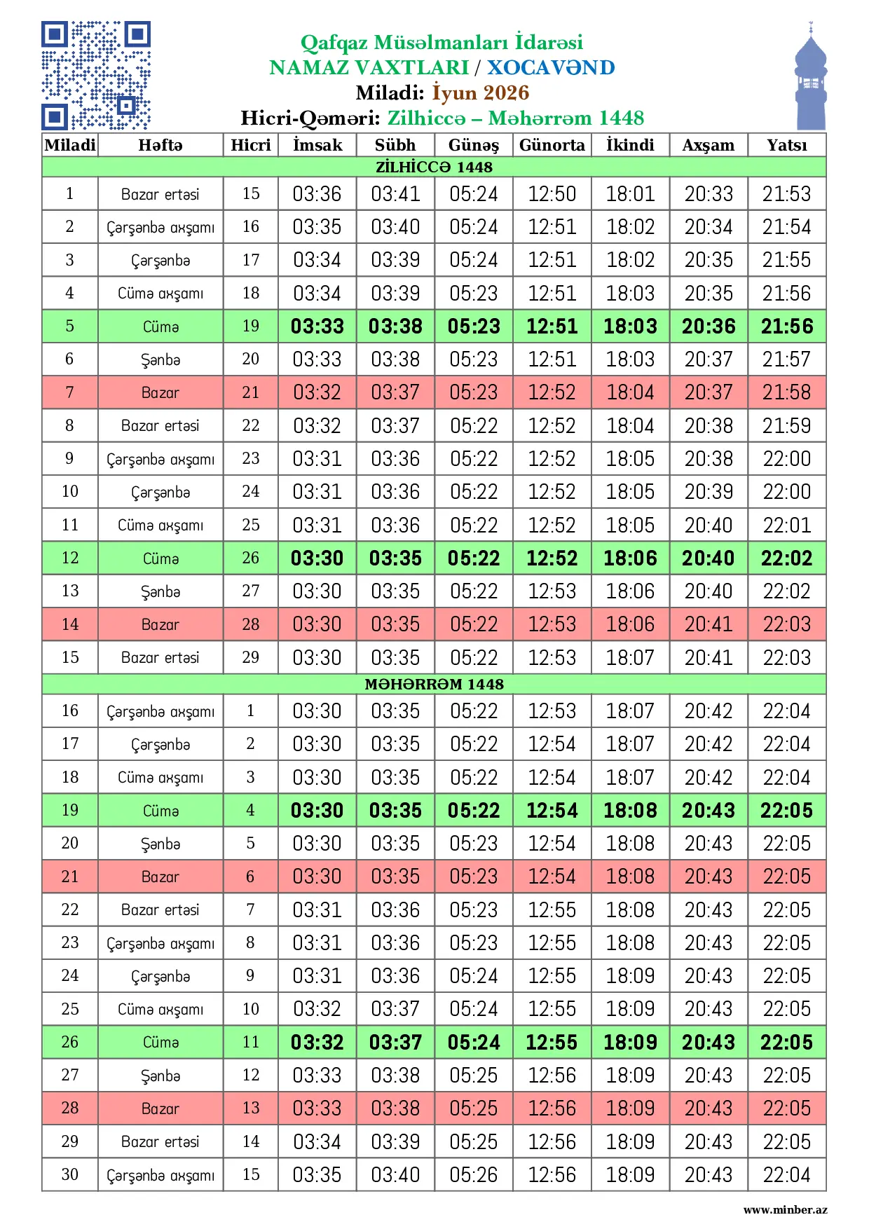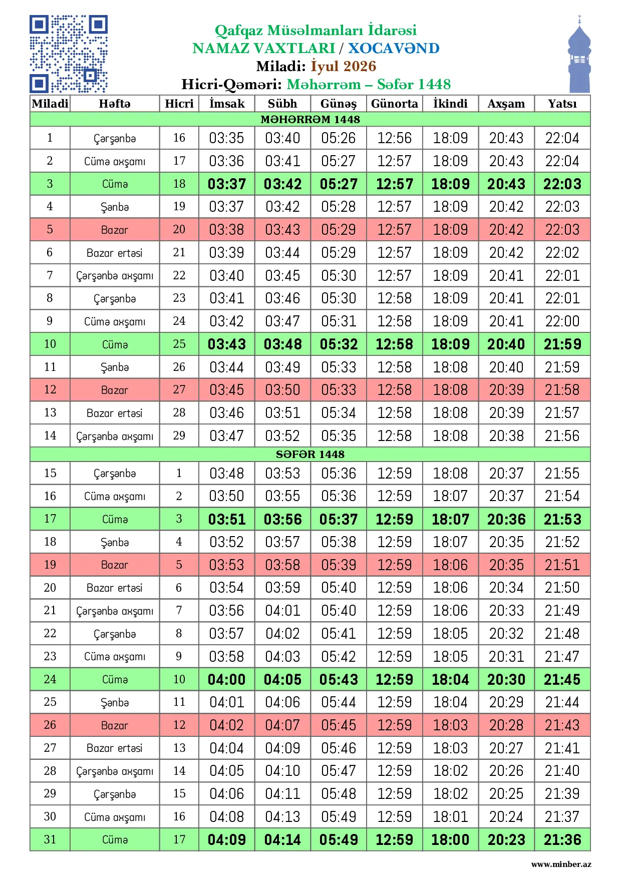 | Miladi | Həftə | Hicri | İmsak | Sübh namazı | Günəş | Günorta namazı | İkindi namazı | Axşam namazı | Yatsı namazı |