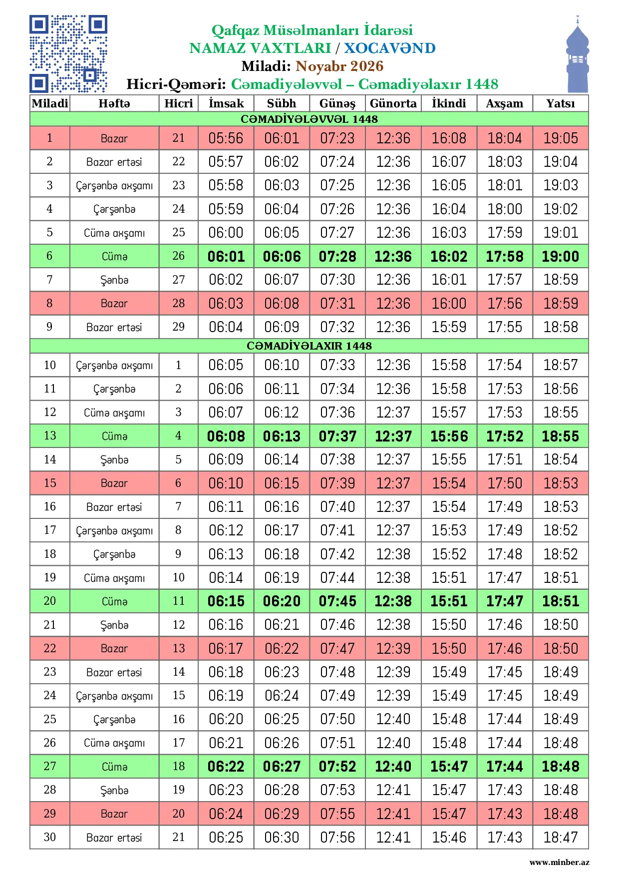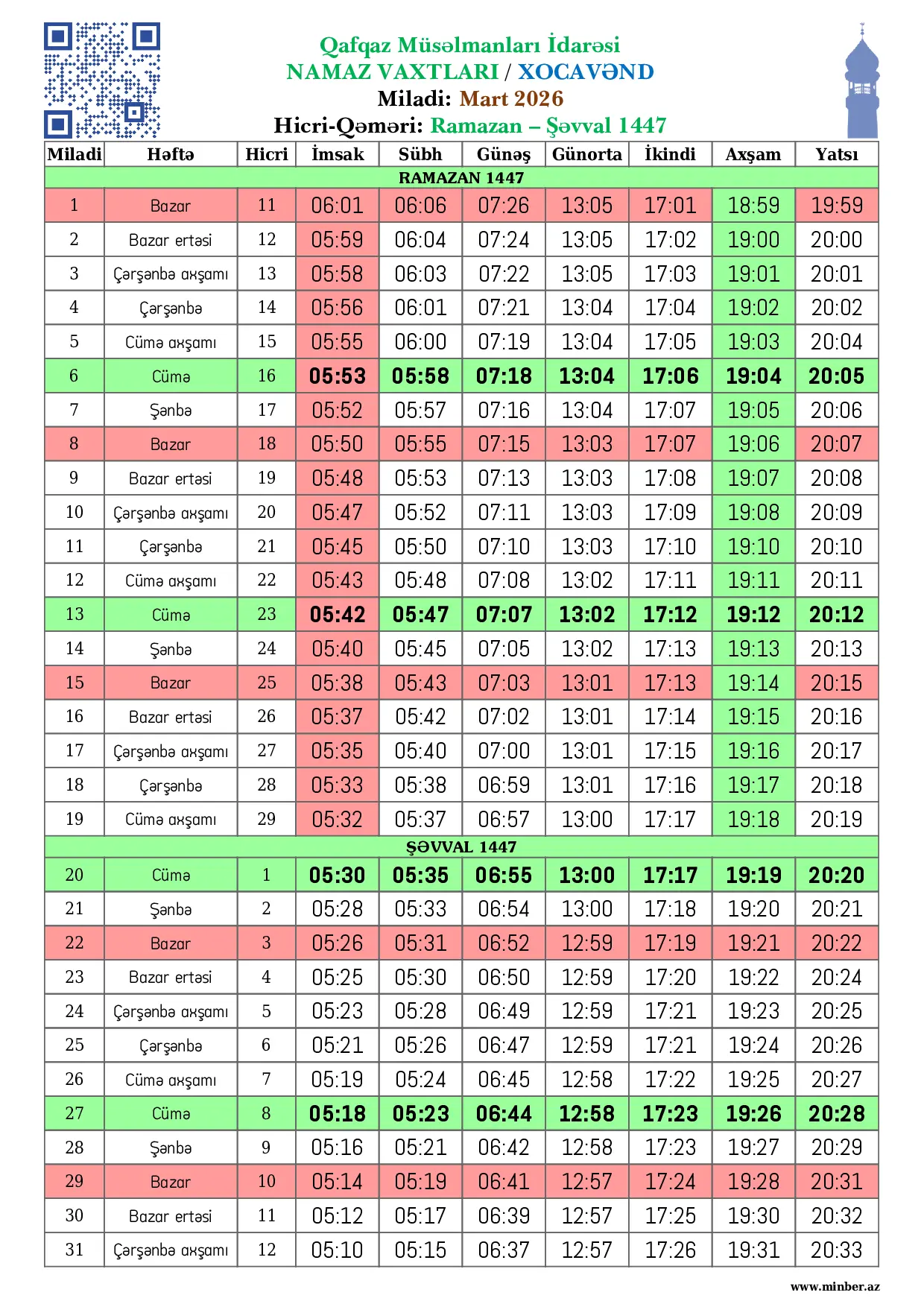 | 28 Fevral 2026 | Şənbə | 10 Ramazan 1447 | 06:04 | 06:09 | 07:29 | 13:05 | 16:59 | 18:56 | 19:57 |