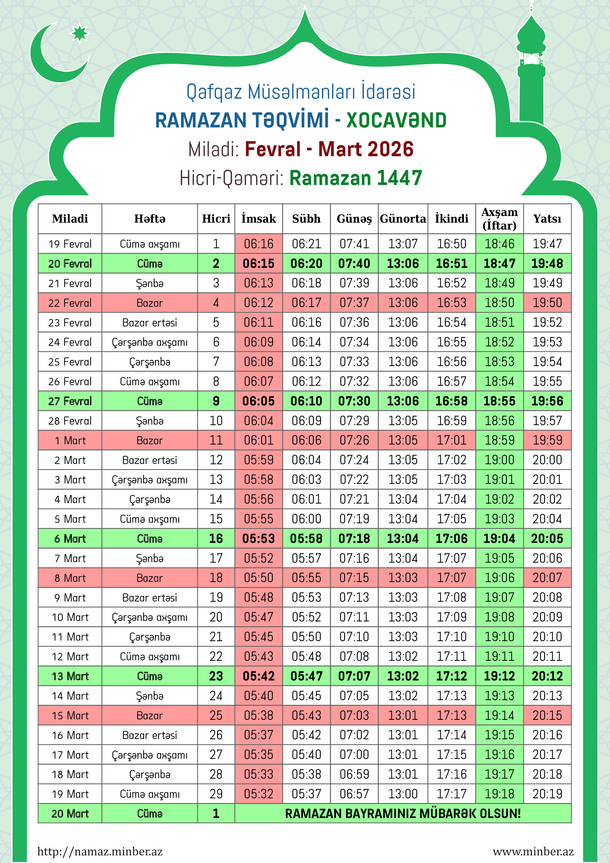 | 27 Fevral 2026 | Cümə | 9 Ramazan 1447 | 06:05 | 06:10 | 07:30 | 13:06 | 16:58 | 18:55 | 19:56 |