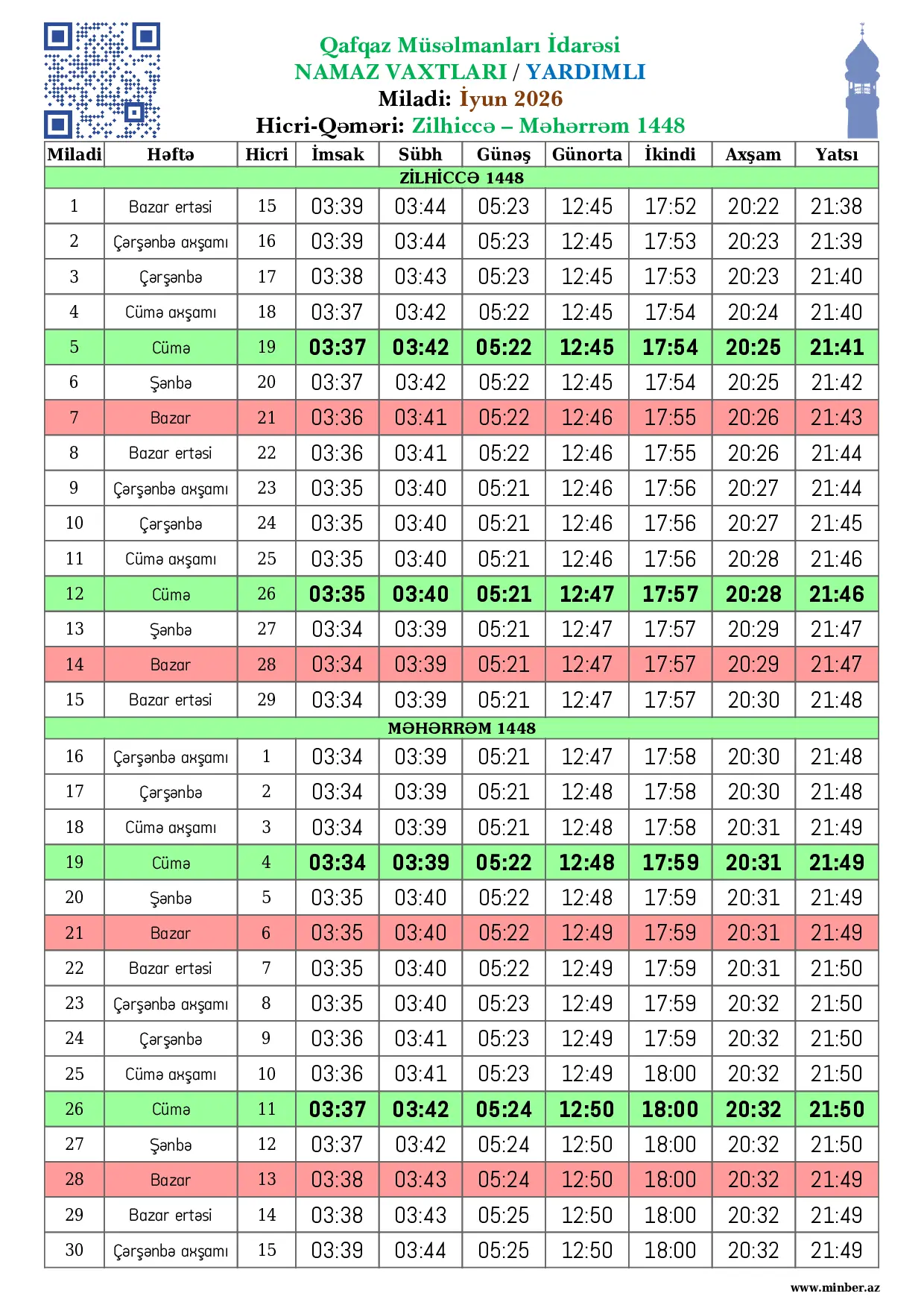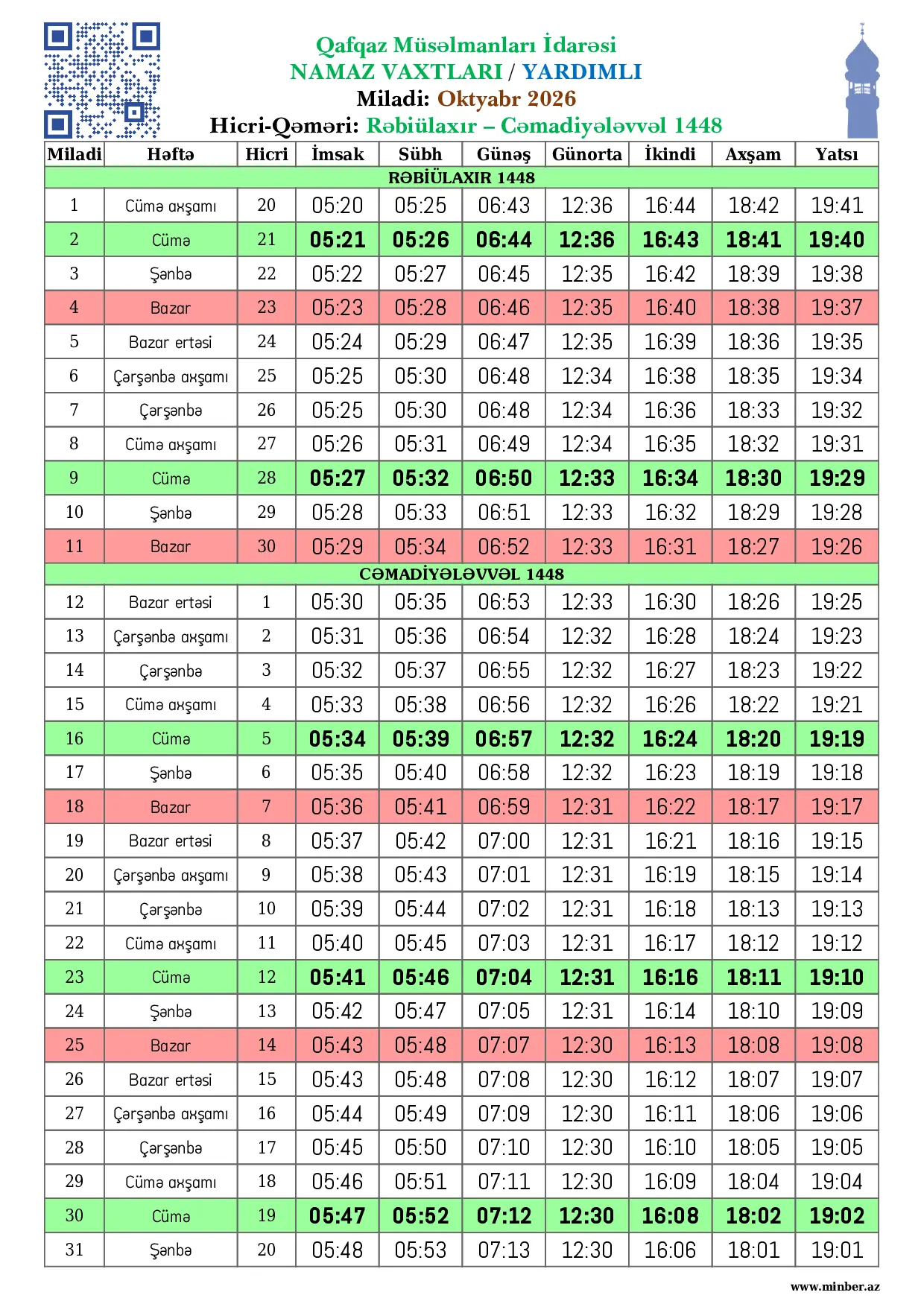 | 5 Fevral 2026 | Cümə axşamı | 17 Şaban 1447 | 06:24 | 06:29 | 07:49 | 13:01 | 16:32 | 18:27 | 19:27 |