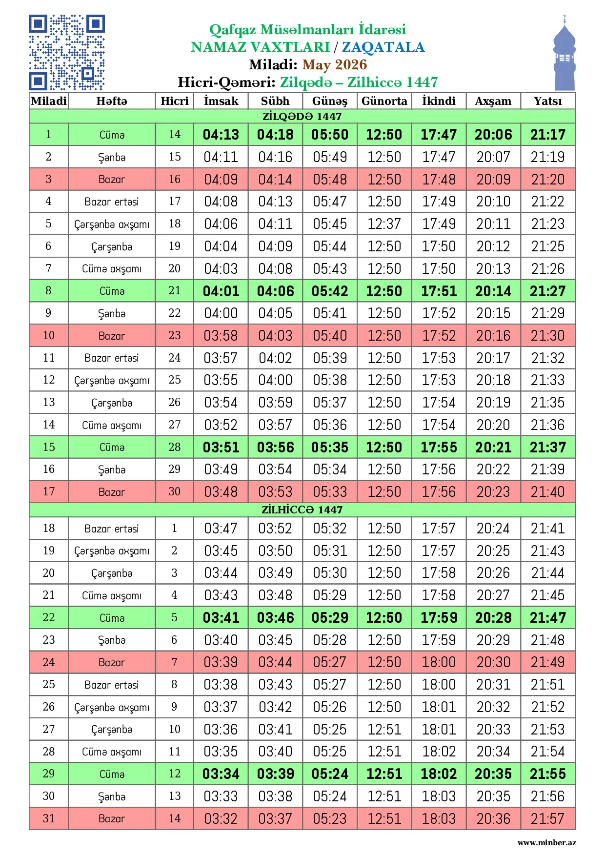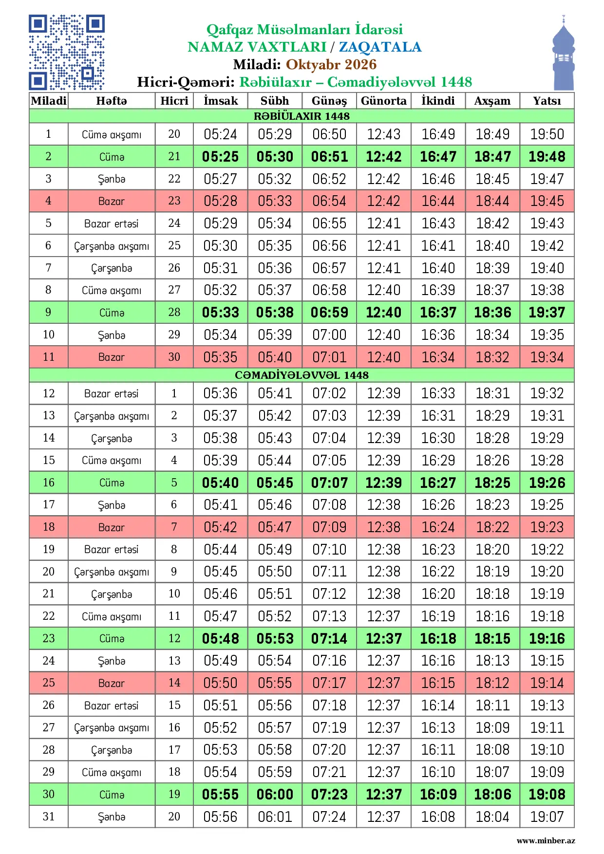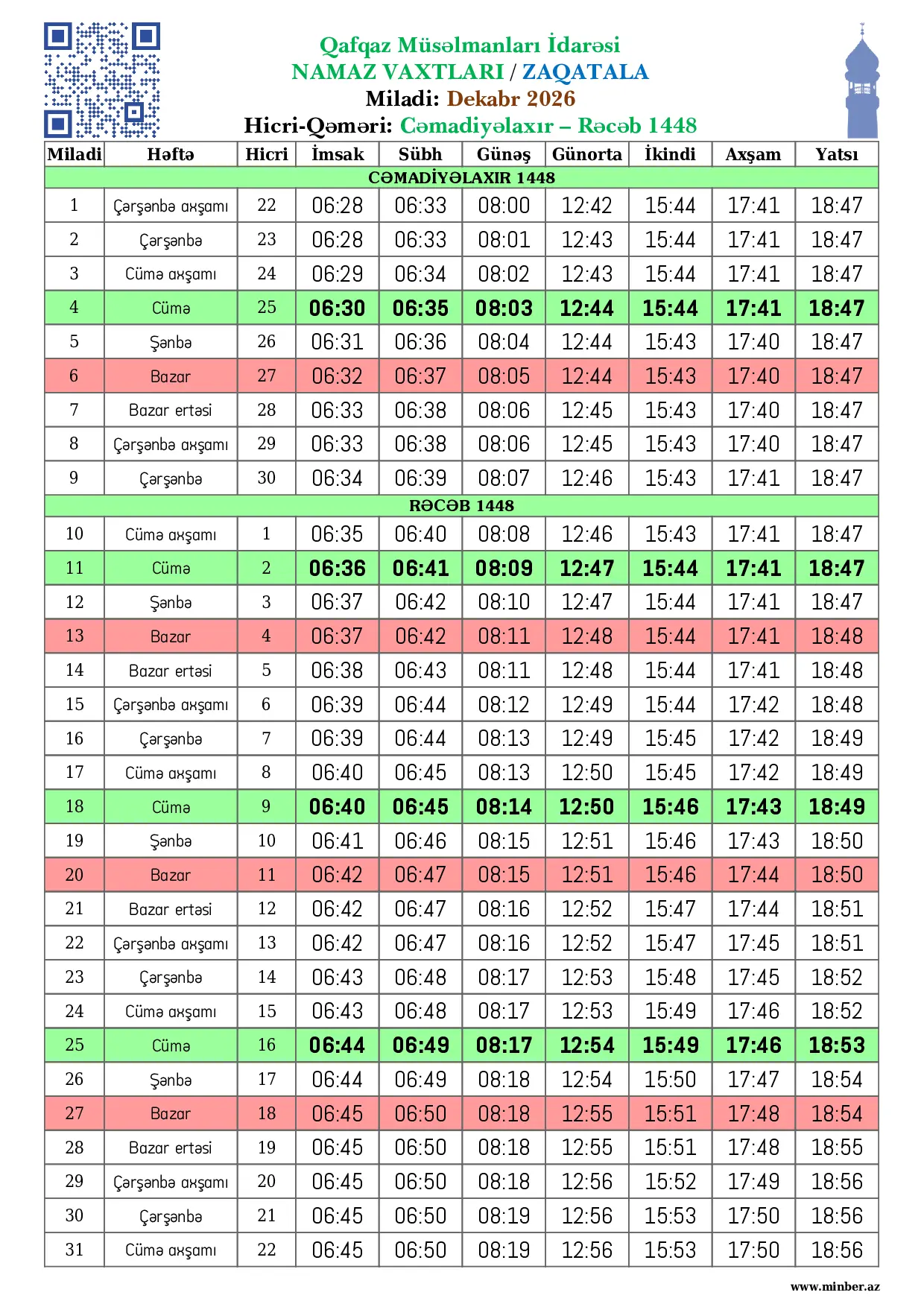 | Miladi | Həftə | Hicri | İmsak | Sübh namazı | Günəş | Günorta namazı | İkindi namazı | Axşam namazı | Yatsı namazı |